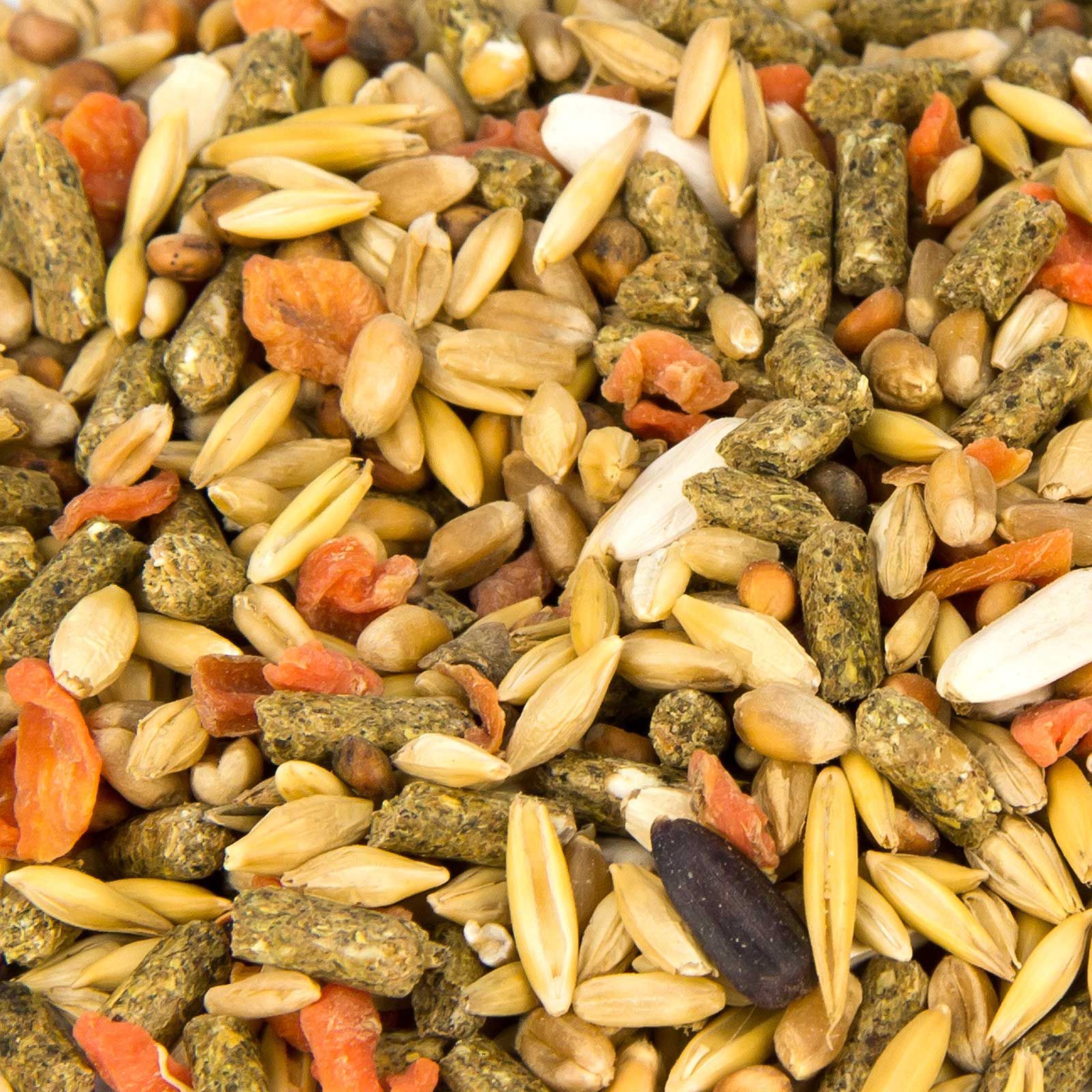 Weizen, Hafer, Braugerste, Rollhafer, Milokorn, Karottenwürfel, Weizenkleie grob, Grünmehl, Sonnenblumenkerne weiß, Maiskraftfutter, Trockenschnitzel, Rapsextraktionsschrotfutter mit Stock, Kürbiskernkuchen, Melasse, Lignocellulose, Calciumcarbonat, Monocalciumphosphat, Natriumchlorid, Natriumbicarbonat, MagnesiumoxidLagerung: