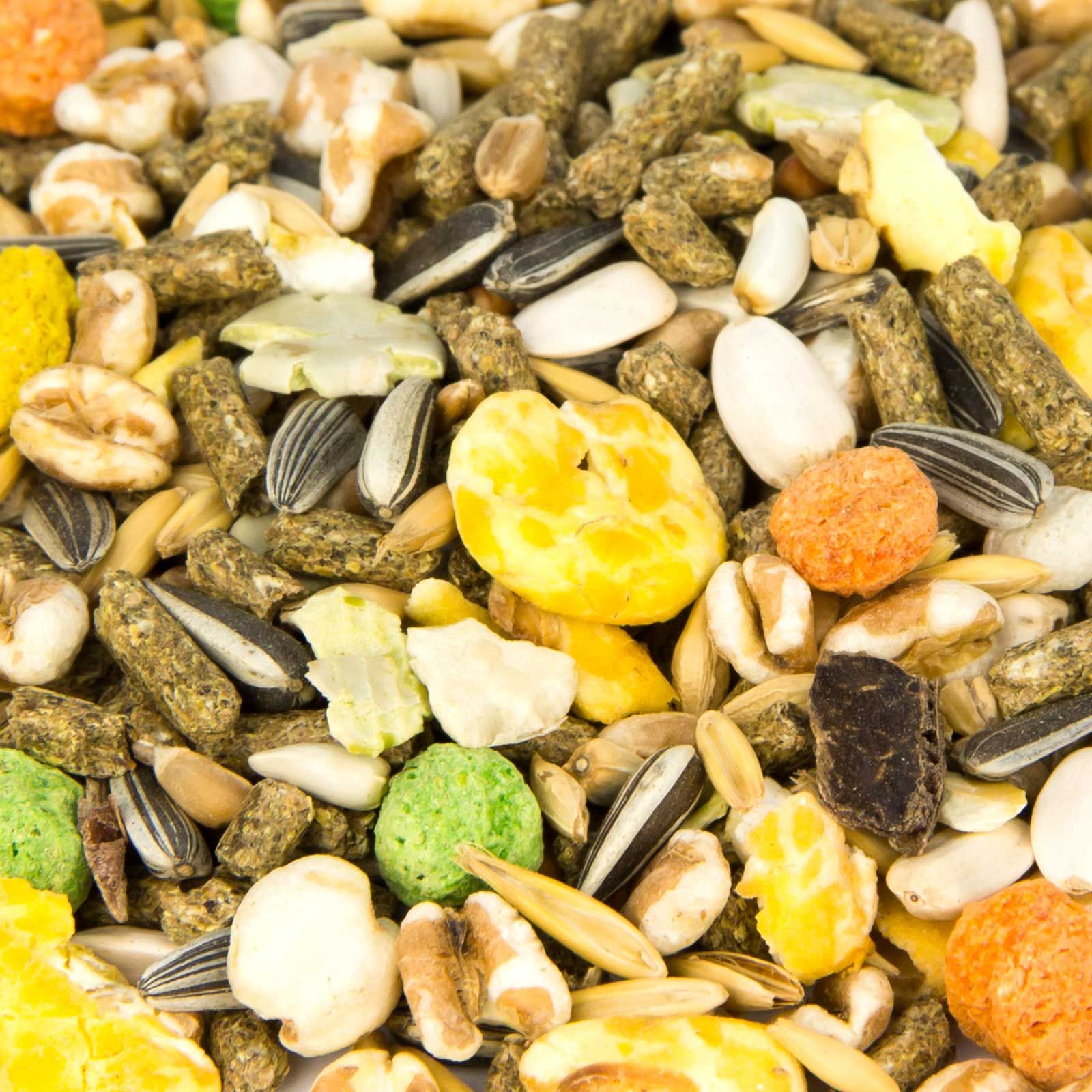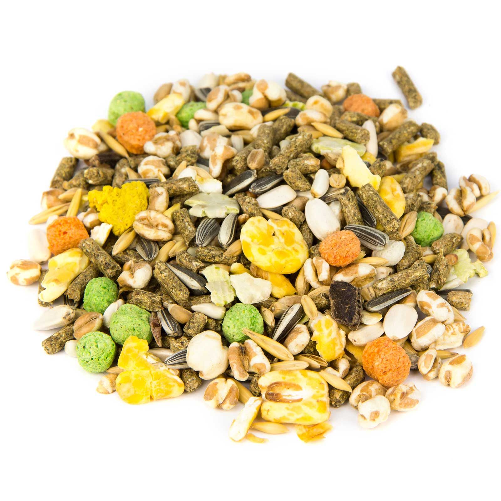 Weizen, Weizenkleie grob, Grünmehl, Mais gepoppt, Sonnenblumenkerne gestreift, Hafer, Braugerste, Erbsenflocken, Kardisaat, Milokorn, Weizen gepoppt, Maiskraftfutter, Trockenschnitzel, Sonnenblumenkerne weiß, Maiskroketten rot, Maiskroketten grün, Johannisbrot geschnitten, Rapsextraktionsschrotfutter mit Stock, Kürbiskernkuchen, Melasse, Maiskroketten gelb, Lignocellulose, Calciumcarbonat, Monocalciumphosphat, Natriumchlorid, Natriumbicarbonat, Magnesiumoxid