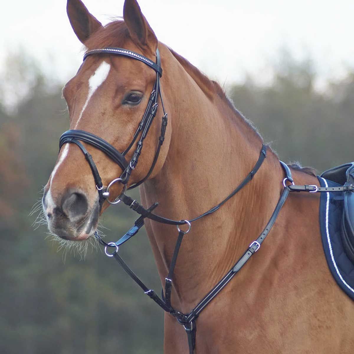 Vorderzeug in bester Lederqualität, solide verarbeitet, mit integrierter, auch wahlweise herauszuschnallender, längenverstellbarer Martingalgabel, verhindert ein Nach-Hinten-Rutschen des Sattels beim Springen.
