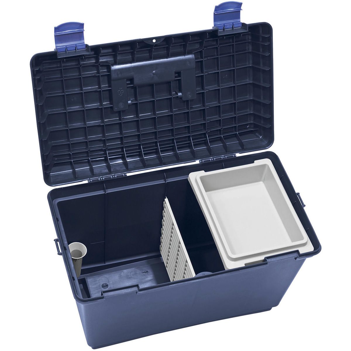 In der sehr stabilen und pflegeleichten Box haben aufrechtstehende 1 Liter-Flaschen optimal Platz. In der Ablage können Kleinteile praktisch verwahrt werden, die herausnehmbare Trennwand ermöglich ein geordnetes aufbewahren aller Bürsten und kämme. Ein extra Behälter für den Hufölpinsel ist ebenso im Innenraum zu finden und verhindert somit das auslaufen auf die anderen Bürsten.