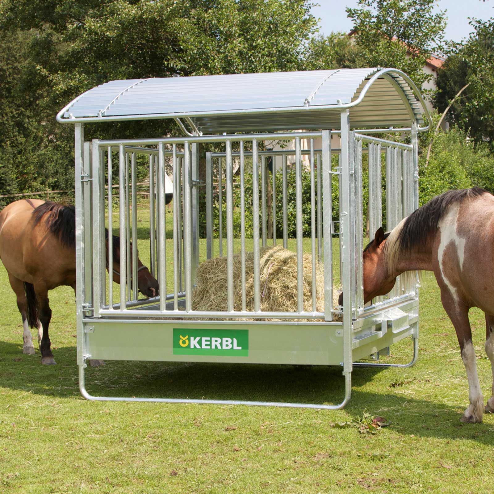 Bei dieser Futterraufe können bis zu 12 Pferde gleichzeituig fressen. Die Heuraufe mit Fressgitter ist für Rund- und Rechteckballen bis 1,8 m Länge bzw. Durchmesser ideal geeignet. Zum Befüllen können 2 Seiten einfach geöffnet werden und durch die höhenverstellbare Kufen ist eine einfache Anpassung an die Tiergröße möglich. Zusammen mit dem Dach sorgt ie Futterraufe für geringe Futterverluste und eine stabile Qualität des Futters. Eine hohe Materialstärke und 2 Vierkantrohr-Unterzüge sorgen für eine sehr stabile Ausführung und bieten, zusammen mit der Dreipunktanhängung, eine hohe Transportfahigkeit. Der umlaufende Dachkantenschutz und der Dreipunkt-Schutzbügel sorgen dafür, dass sich die Pferde nicht an der Futterraufe verletzen können.