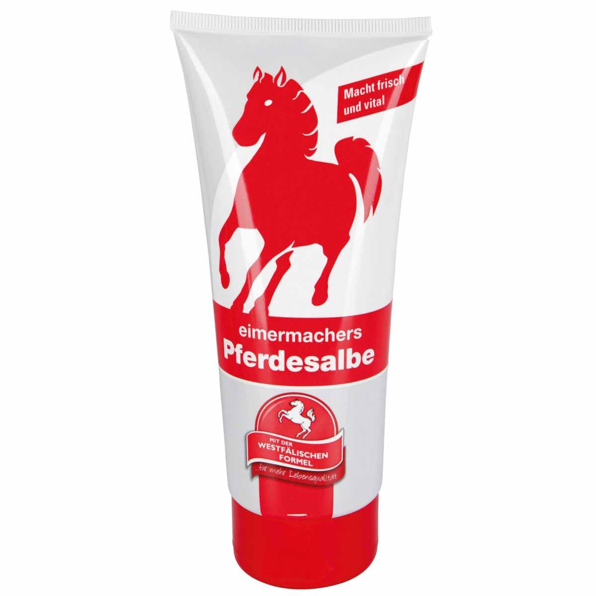 Die eimermachers Pferdesalbe revitalisiert und entspannt nach Beanspruchung und Ermüdung. Mit der altbewährten Rezeptur aus Kampfer, Rosmarin, Arnika, Rosskastanienextrakte und vielen weiteren wertvollen Inhaltststoffen aktiviert die eimermachers Pferdesalbe die müde Muskulatur, Sehnen und Gelenke nach getaner Arbeit und dem Sport. Die Anwendung der Pferdesalbe mit der westfählischen Formel ist ganz einfach. Die Salbe auf die beanspruchten Stellen auftragen und einmassieren. Gerne wird die Pferdesalbe auch zur durchblutungsfördernden Massage angewendet und dient zur Erholung von Körper und Geist. Das fettfreie Gelzieht schnell ein, verklebt nicht und macht frisch und vital.