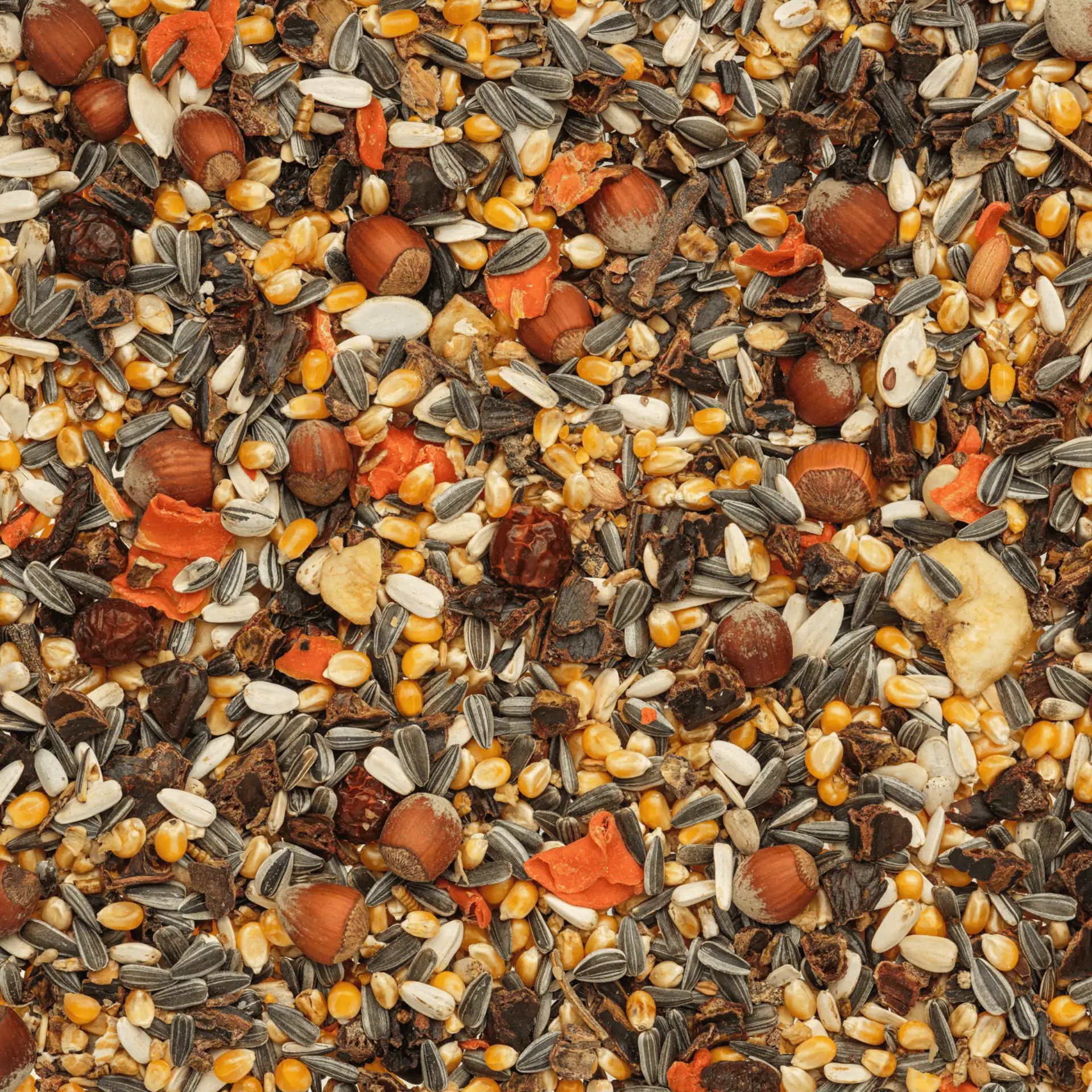 30,00 % Kleinmais, 23,00 % Sonnenblumenkerne gestreift, 20,00 % Johannisbrot geschnitten, 10,00 % Sonnenblumenkerne weiß, 9,30 % Haselnüsse, 2,10 % Rosinen, 2,00 % Mehlwürmer getrocknet, 1,30 % Karottenscheiben, 1,30 % Bananenchips, 0,70 % Hagebutten, 0,30 % Kürbiskerne weiss