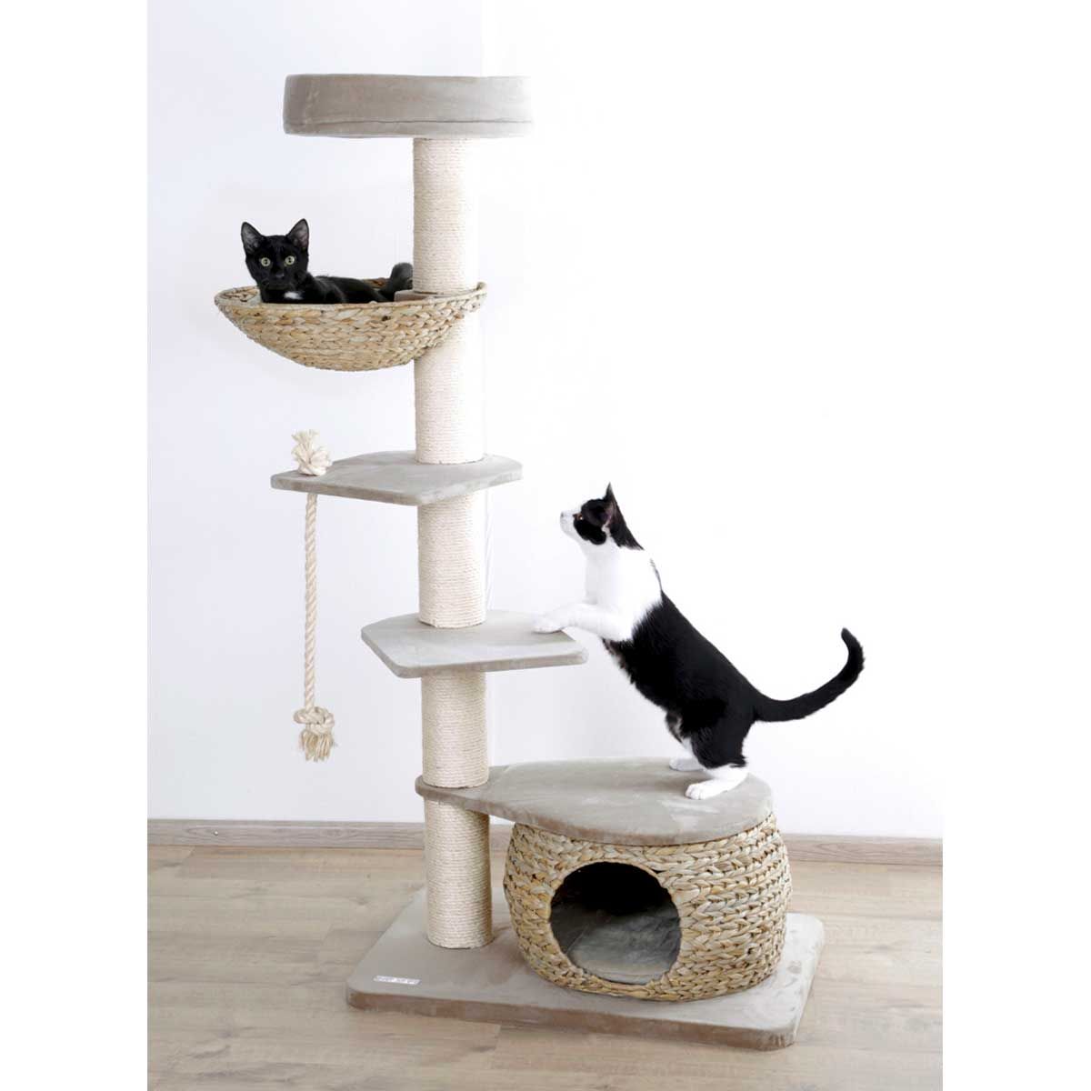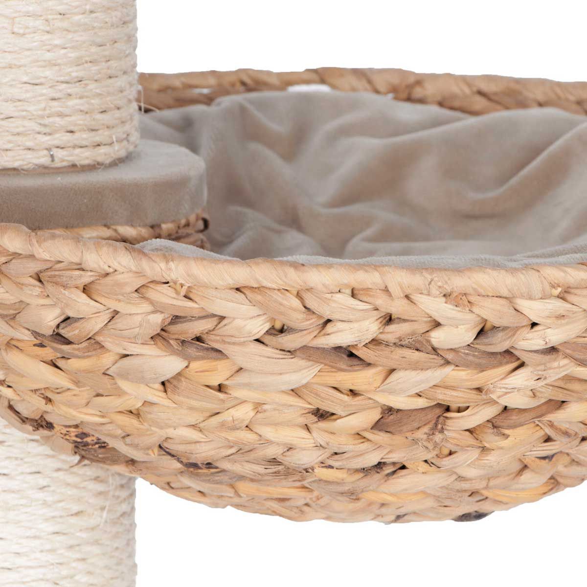 Die Liegefläche und - höhle wurde aus nachhaltigen Bananenblättern handgeflochten. Der Kratzbaum ist äußerst robust, kratzfest und zeitlos. Die gepolsterten Liegeflächen sorgen für mehr Komfort.