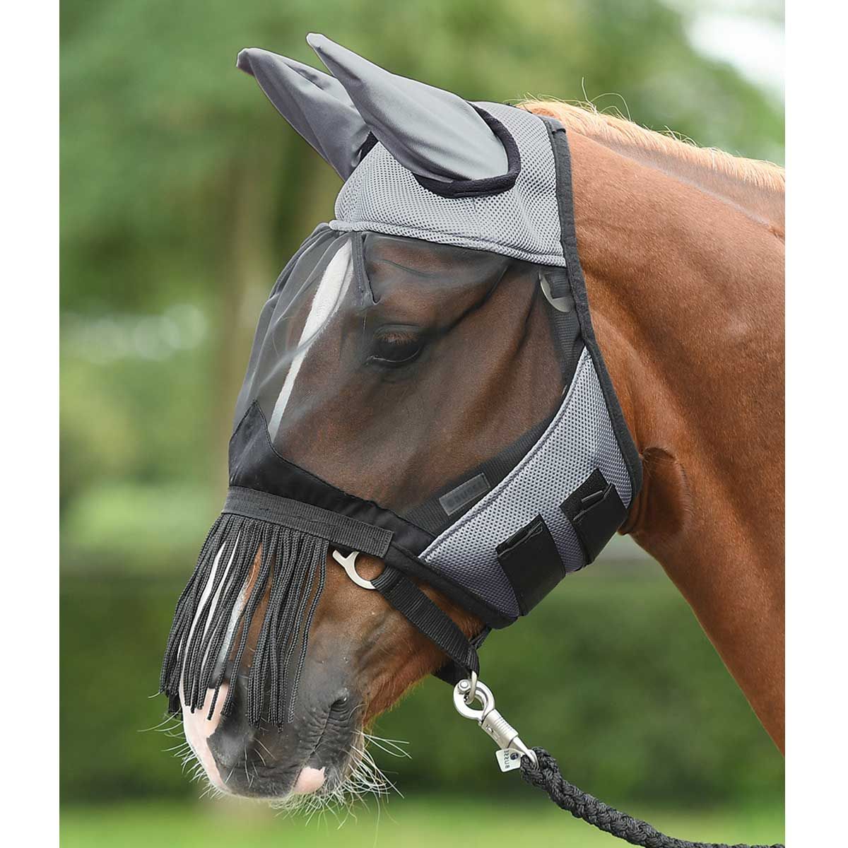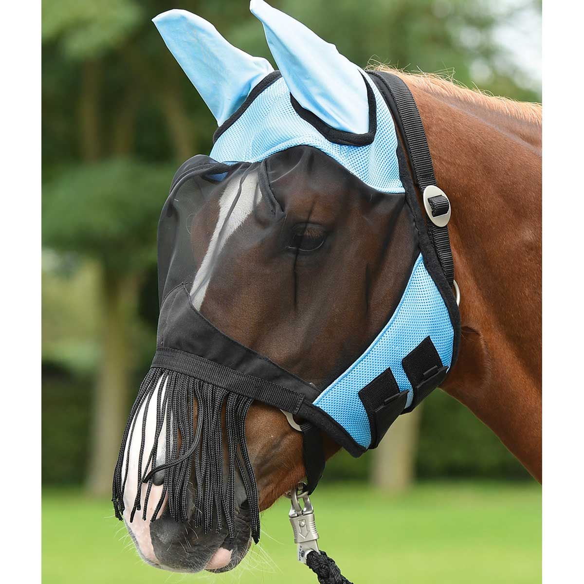 Fliegenmaske mit fixierten Fransen im Nüsternbereich.