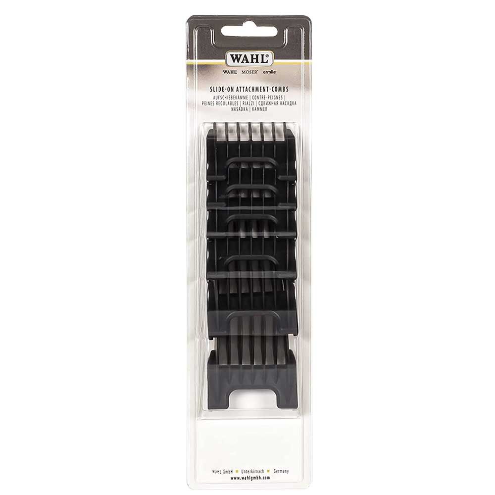 Die WAHL Aufsteckkämme in 6 Größen sind für die meisten Wahl-Haarschneidemaschinen geeignet. Mit diesem schwarzen Kunststoffkamm-Set haben Sie alle benötigten Schnittlängen zur Hand. Diese Führungskämme für Wahl Schermaschinen sind langlebig und lassen sich leicht an- und abnehmen.