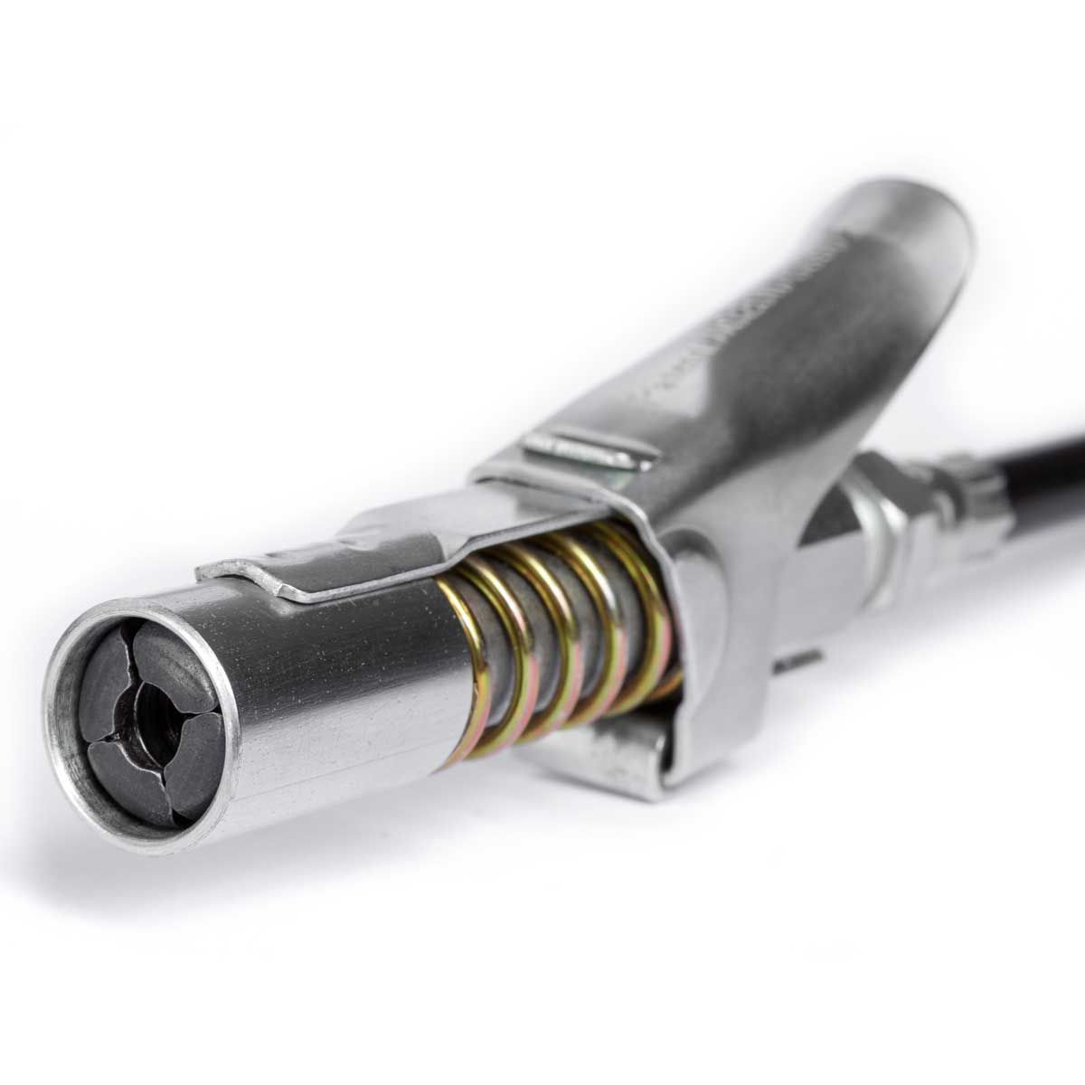 ermöglicht sicheres und einfaches Abschmieren bei Wartungsarbeiten, auch unter Hochlastbetrieb kein Fettverlust. Einfach ankuppeln, loslassen und arbeiten ohne festzuhalten.