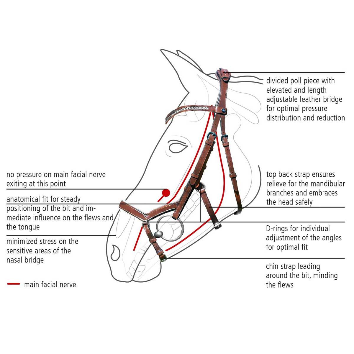 - extra kurzer, weich gepolsterter Nasenriemen, der auf mittlerer Höhe des Nasenbeins platziert ist, um Belastung auf sensible Nervenbahnen, Blutgefäße und Knochenbereiche am Nasenrücken und Jochbein zu minimieren