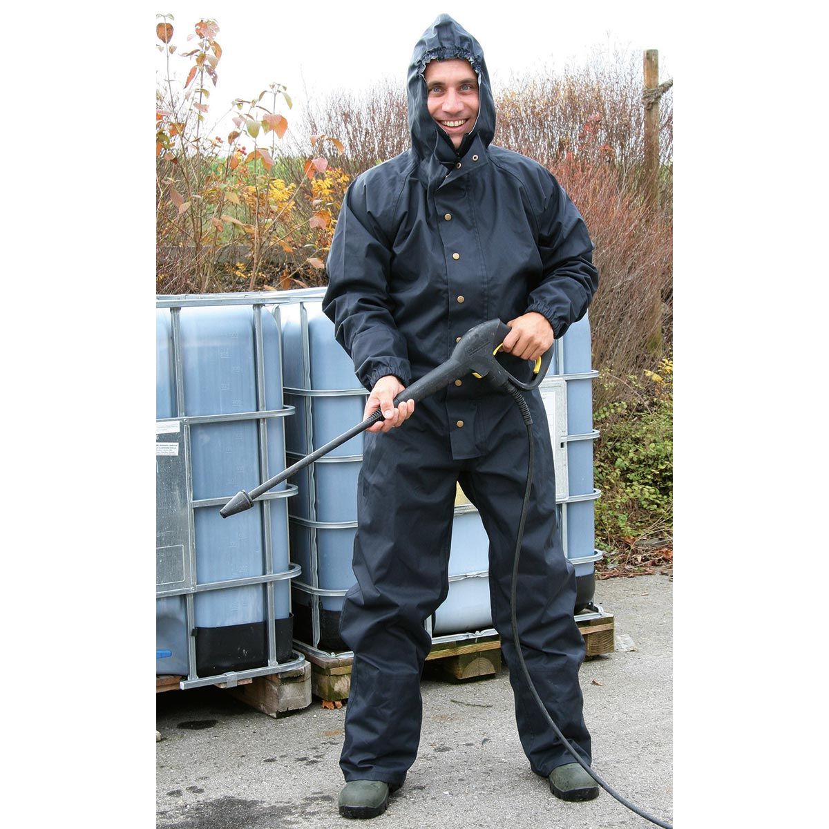 Die Kapuze enthält einen Gummizug im Gesichtsbereich und Klettverschluss am Hinterkopf zur individuellen Anpassung an die jeweilige Körpergröße. Der Overall kann in oder über den Stiefeln getragen werden. Mit eingearbeitetem Gummibund im Rückenbereich und Reißverschlussabdeckung durch extra Knopfleiste. Der am Halsansatz eingearbeiteter Schutzlatz verhindert das Eindringen von Nässe. Mit wasserdicht abgeklebten Nähten. Waschbar bei 30° C.