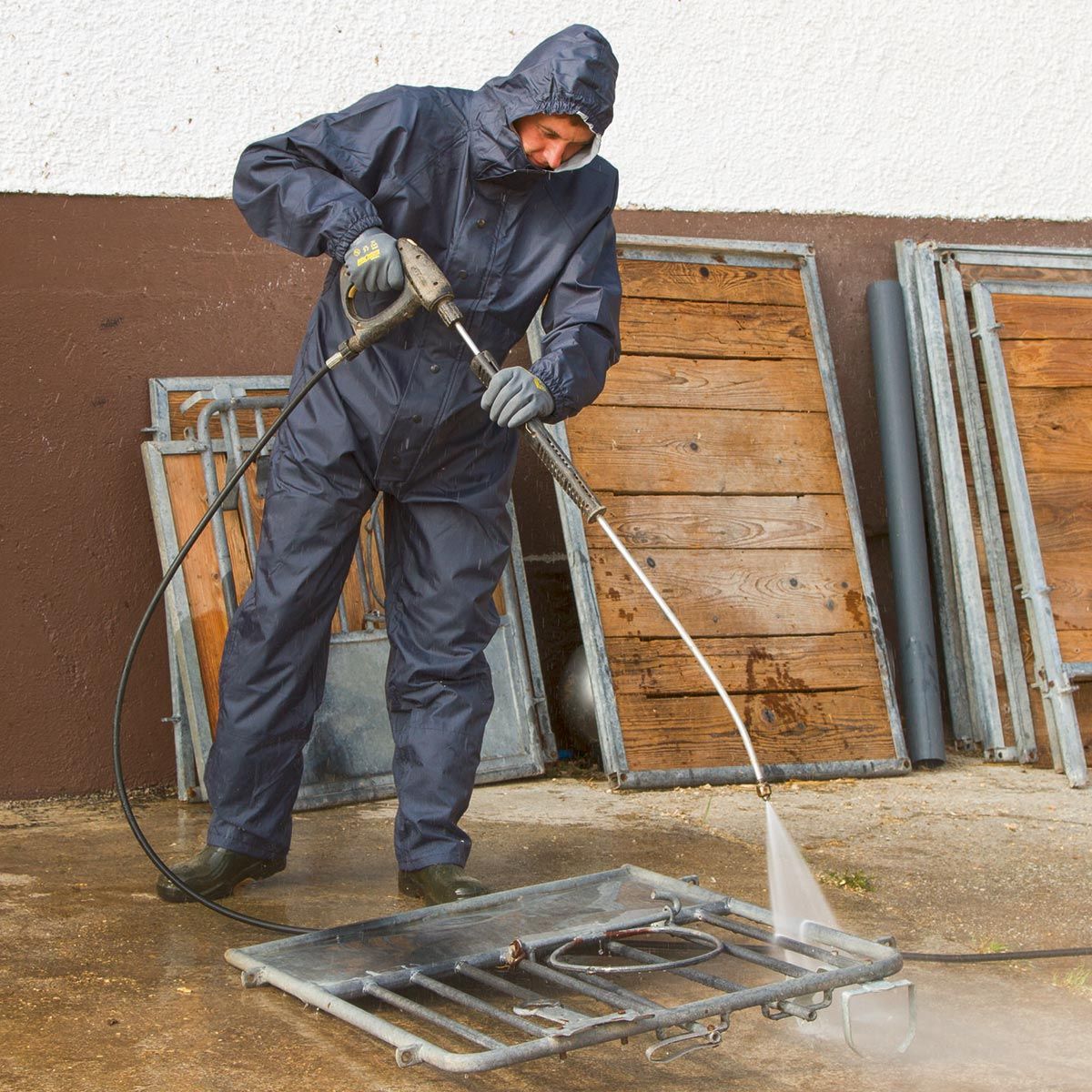 Der funktionelle Kerbl Waschoverall und Reinigungsoverall mit Kapuze und Aufhängeschlaufe am Nacken ist besonders für raue und dauerhafte Arbeiten in der Landwirtschaft geeginet. Das strapazierfähige Gewebe ist wasserfest, atmungsaktiv und eignet sich besonders für Arbeiten im Freien. Dicht schließender Ärmelbund und doppelter Beinabschluss bieten optimalen Schutz vor Schmutz und Feuchtigkeit.