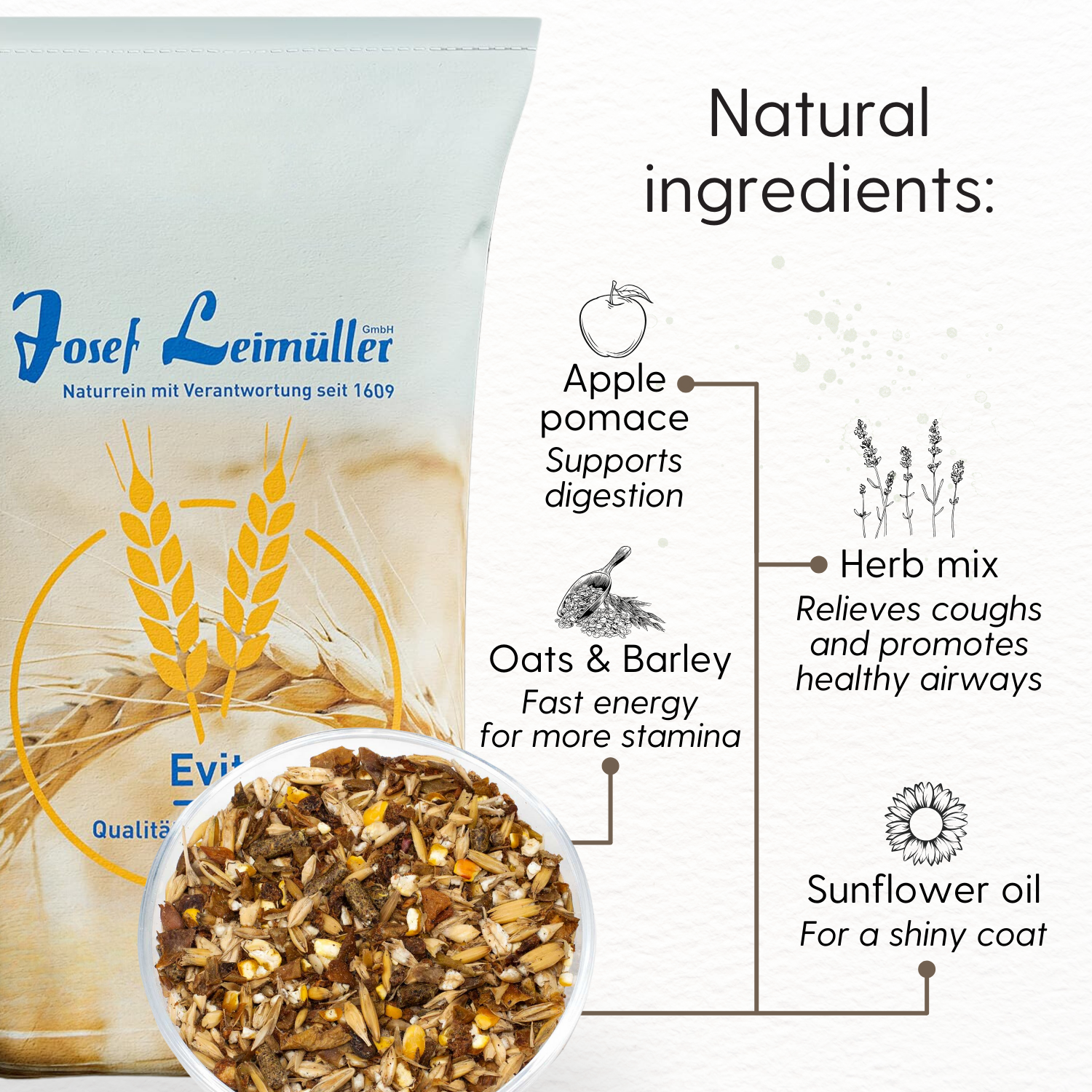 Das Leimüller Pferdefutter ist besonders gut verdaulich. Das Futter ist staubarm, da reines Sonnenblumenöl enthalten ist und wurde schonend mit größter Sorgfalt in Österreich hergestellt. Garantiert gentechnikfrei! Enthält eine natürliche Mischung aus verschiedenen Kräutern und Gräsern (gegen Husten und gut für die Atemwege).
