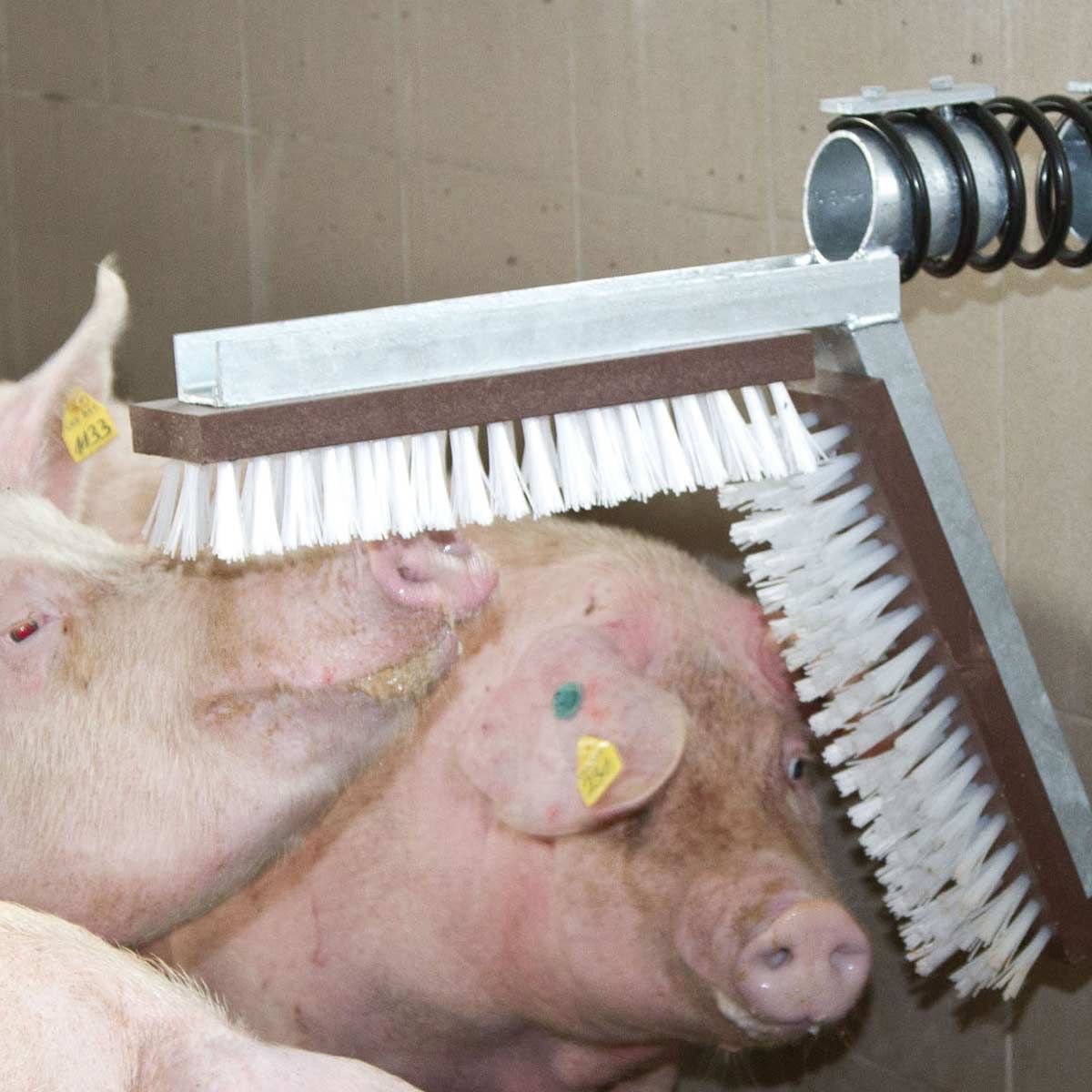 Die Schweinekratzbürste wurde speziell entwickelt für die Gruppenhaltung von Schweinen. Die Bürste zur Wandmontage kann gut Langeweile vertreiben und hilft auch bei Juckreiz und Insekten. Die Schweinebürste ist an einer Stelle anzubringen (z. B. Fressplatz), wo sich viele Schweine gleichzeitig aufhalten. Die Montagehöhe richtet sich nach der Größe der Schweine, die Tiere sollten aber mit der horizontalen Bürste sich gut den Rücken massieren können, indem sie etwas gegen die Borsten drücken können. Die seitliche Bürste dient zur Pflege der Flanken.
