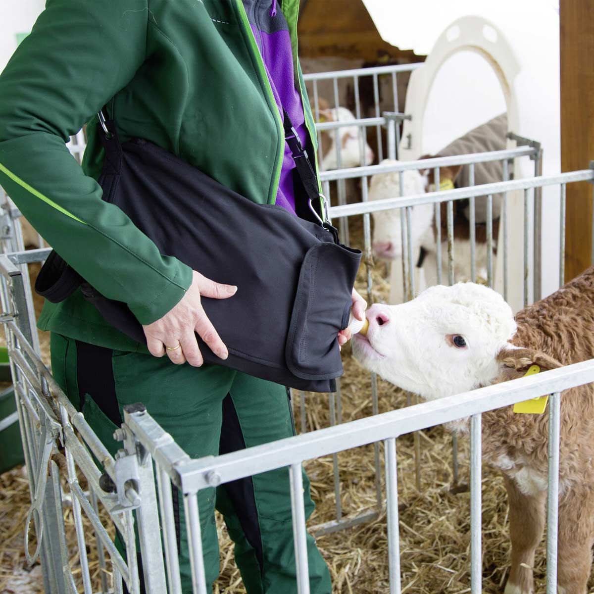 Zur komfortablen Befüllung der Beutel gibt es die Abfüllhilfe ColostroFILLER an. Die optionale Tränketasche ColostroCASE hält die Biestmilch länger warm und erleichtert die Fütterung.