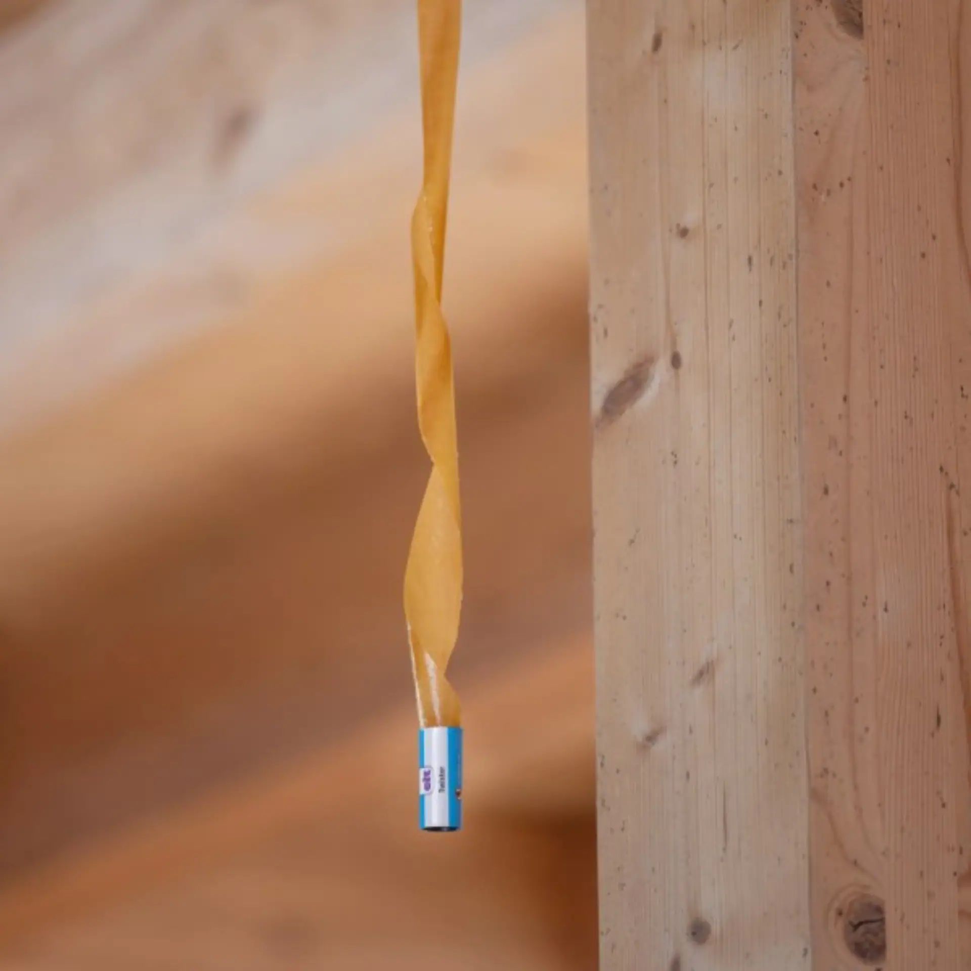 Den aufgerollten Twister mit Hilfe der roten Schlaufe unter vorsichtigem Drehen aus der handwarmen Hülse ziehen und mit dem beiliegenden Reißnagel an der Decke befestigen.
