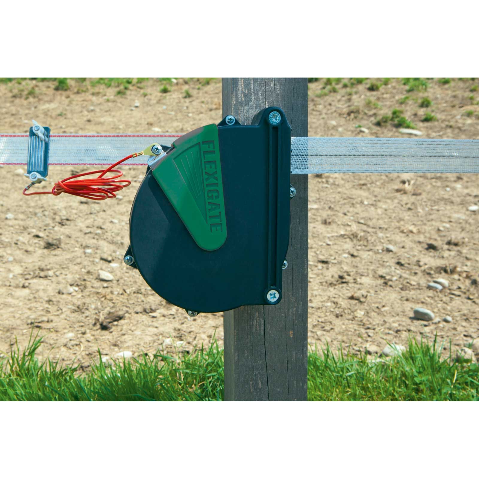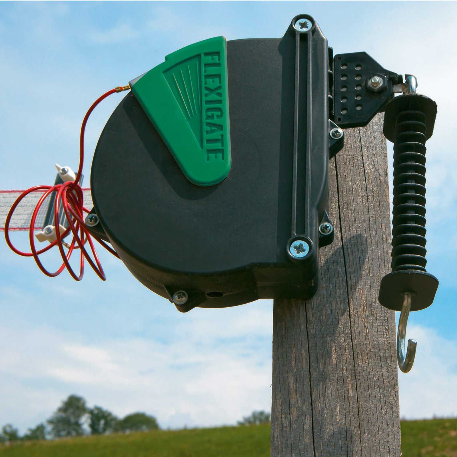 Mit dem Flexigate Torsystem können Sie Koppeleingänge bei Ihrem Weidezaun einfach und bequem unter Strom setzen. Bei jedem Öffnen wird das Elektroseil von einer Stahlfeder eingerollt.