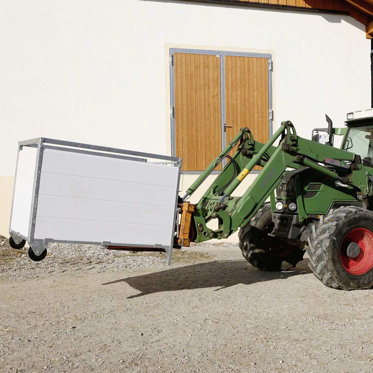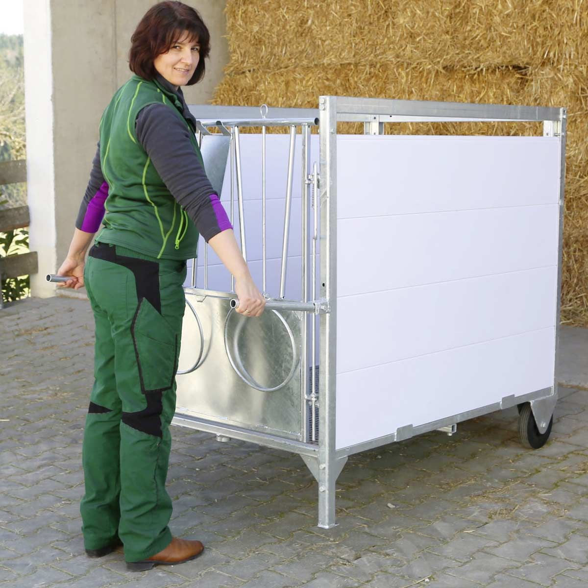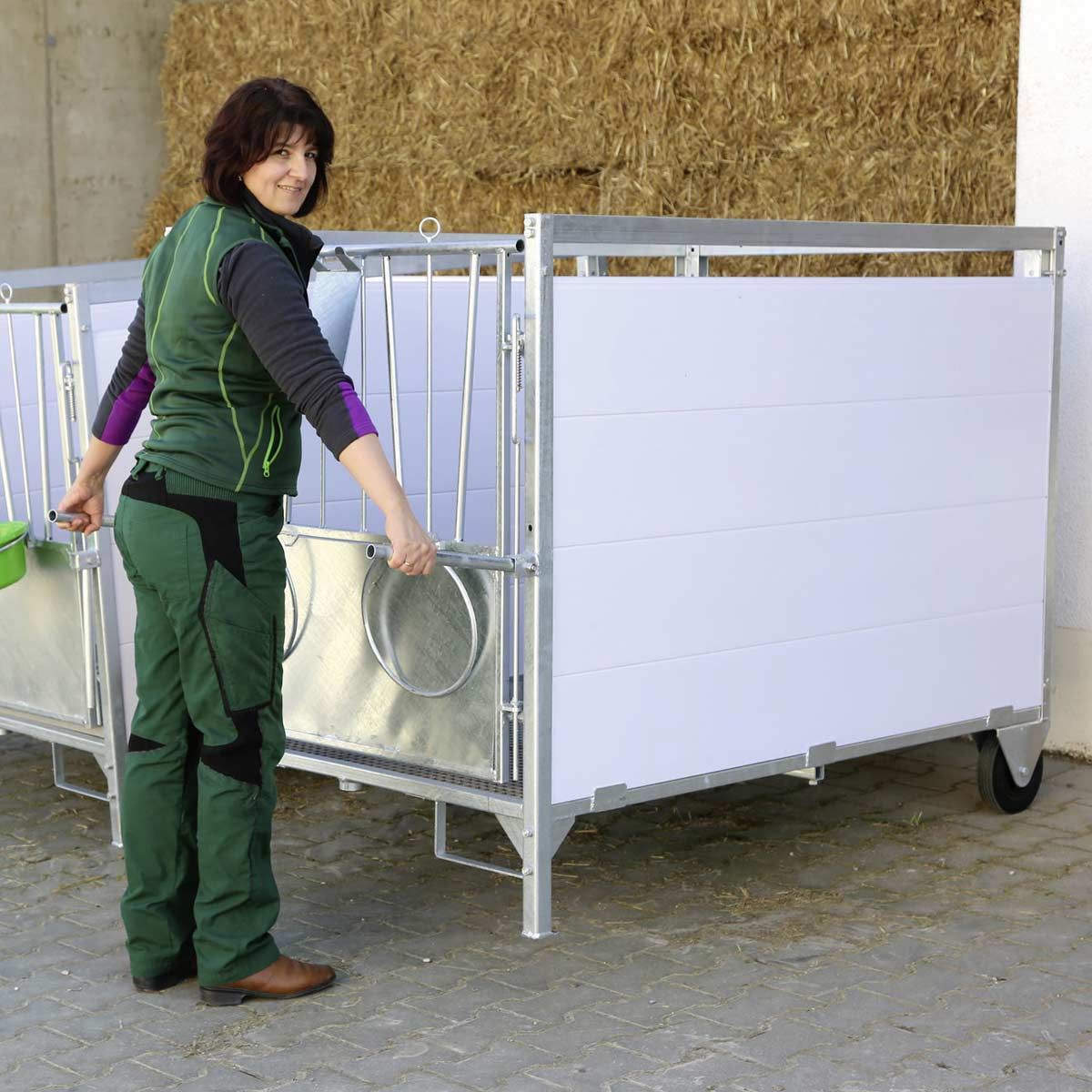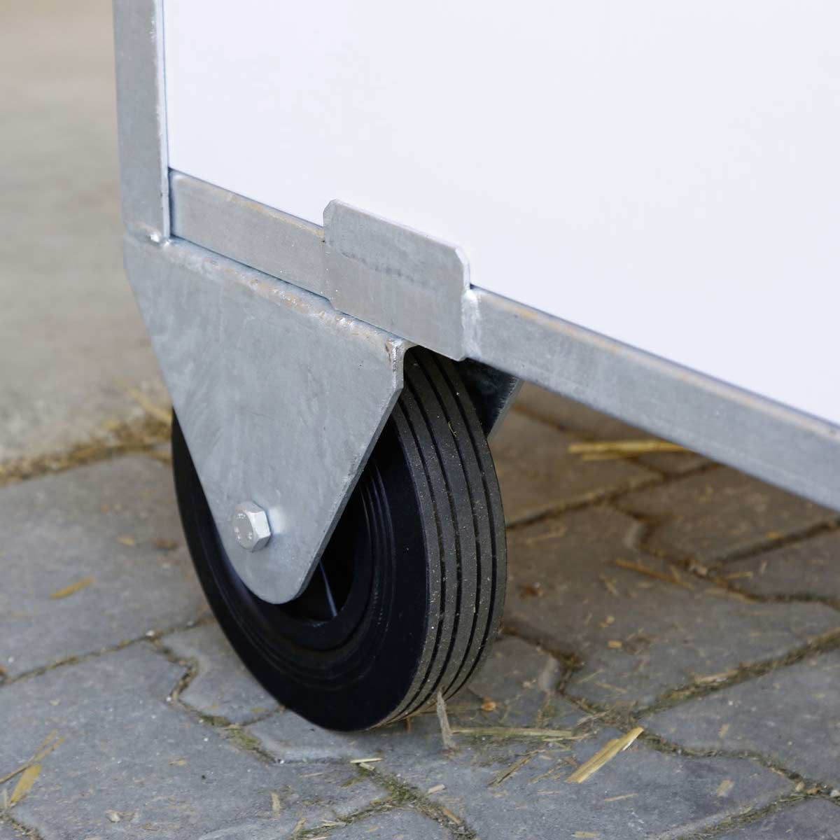 Die extra großen Gummiräder und Klappgriffe an der Vorderseite ermöglichen das einfache Versetzen der Kälberbox. Durch den stabilen, verzinkten Metallrahmen ist ein Transport mit Palettengabeln möglich.