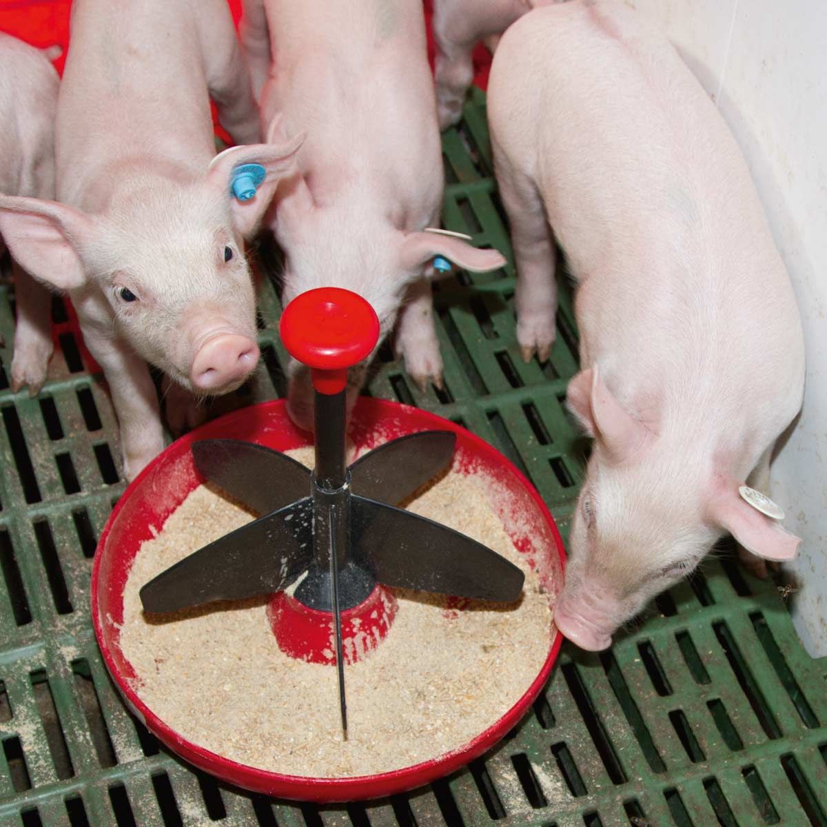 - Die Flügel, mit der die Schale in 5 Fressplätze unterteilt ist, verhindern, dass die Schweine Futter aus der Schale werfen, und dass sie in die Schale steigen und das Futter verunreinigen