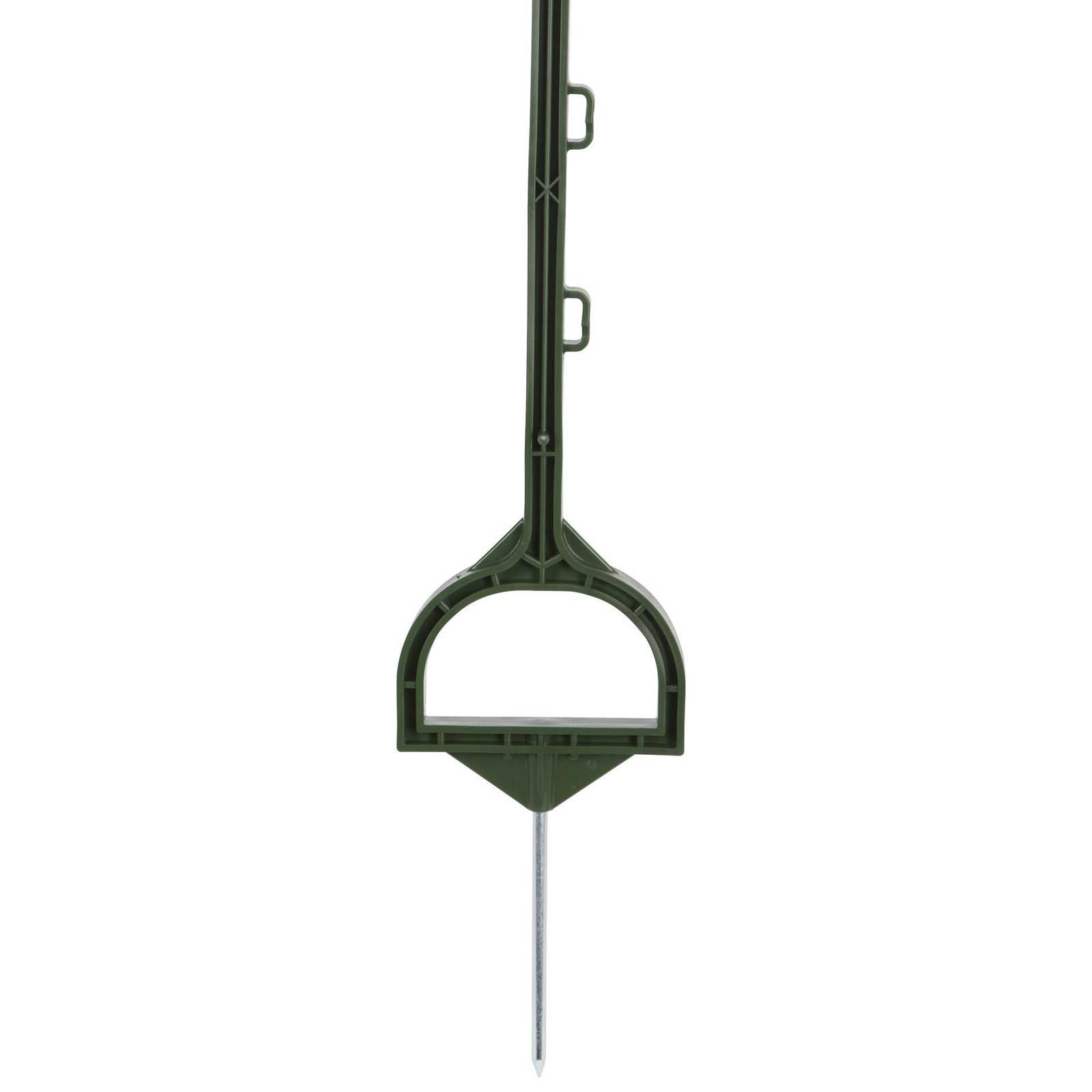 Besonders an den Kunststoffpfählen ist der Steigbügel für ein optimales Eintreten direkt über dem verzinkten Bodennagel mit 19 cm Länge. Der Verdrehschutz verhindert ein Verdrehen der Pfähle und erhöht damit die Sicherheit und Stabilität der Weidezäune .