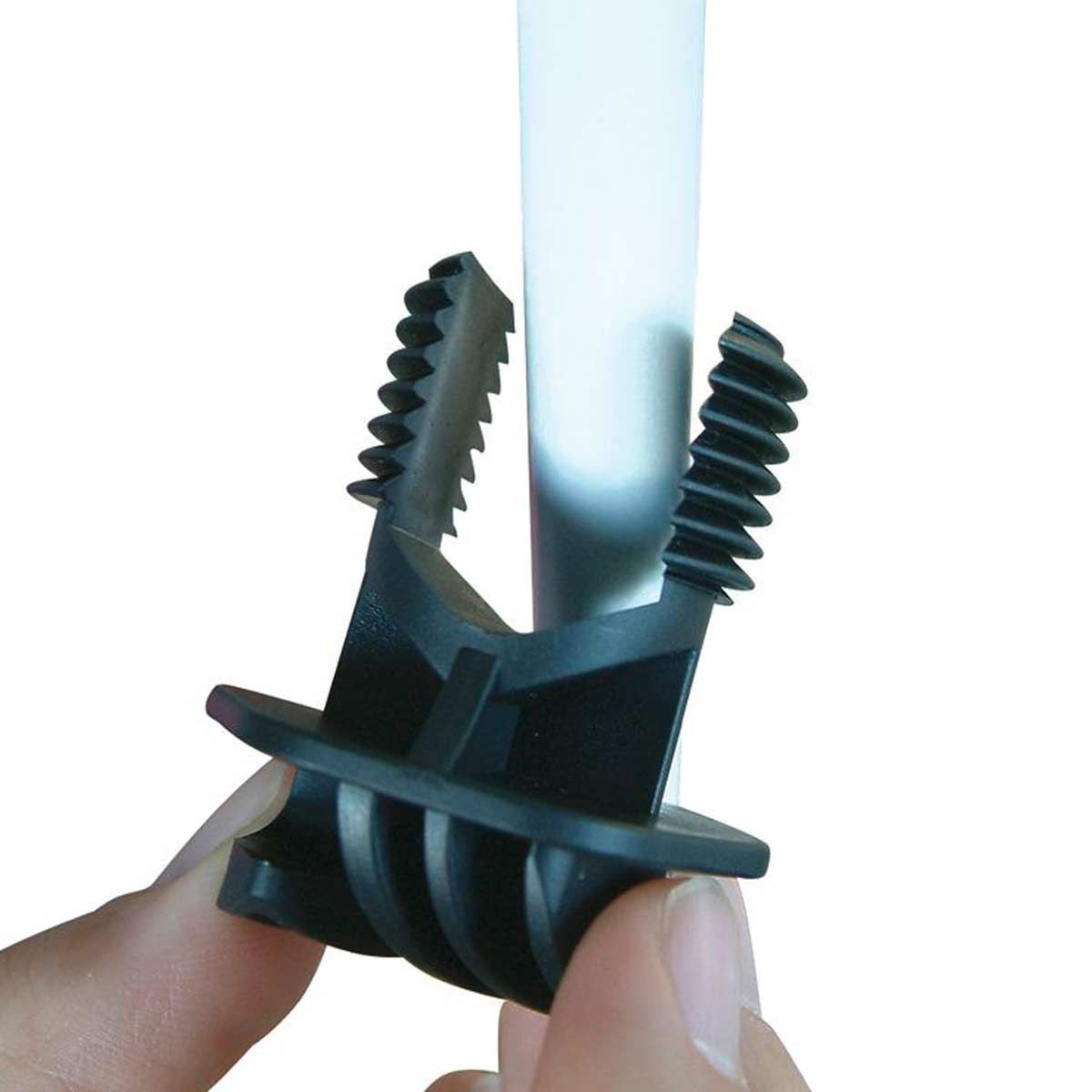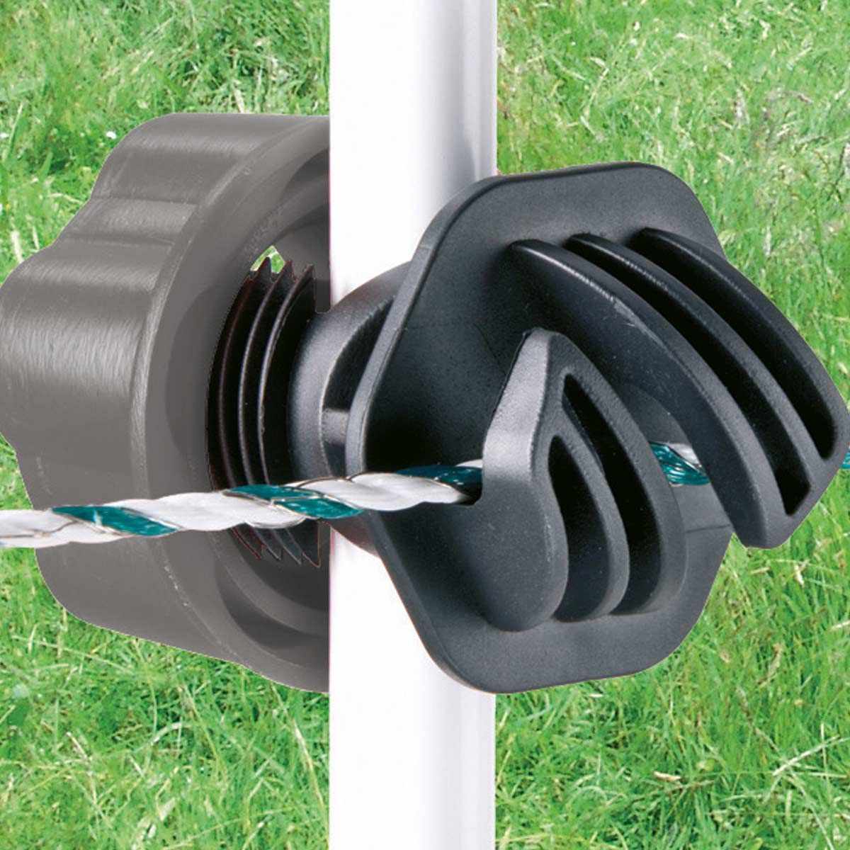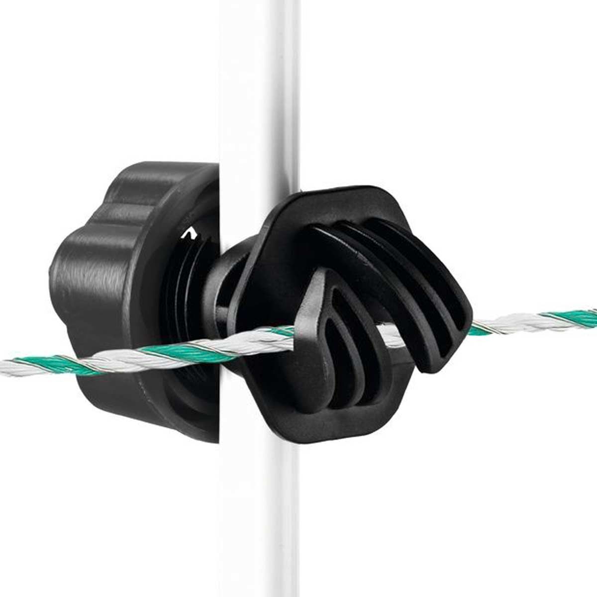 Der Isolator ist für alle gängigen Metall- oder Kunststoffpfähle von 6 bis 17 mm Durchmesser geeignet. Der Schraubisolator ist seitlich an den Pfahl aufzustecken und einfach festzudrehen. Der patentierte Schraubisolator ist aus schlagzäherm Kunststoff und äußerst robust.