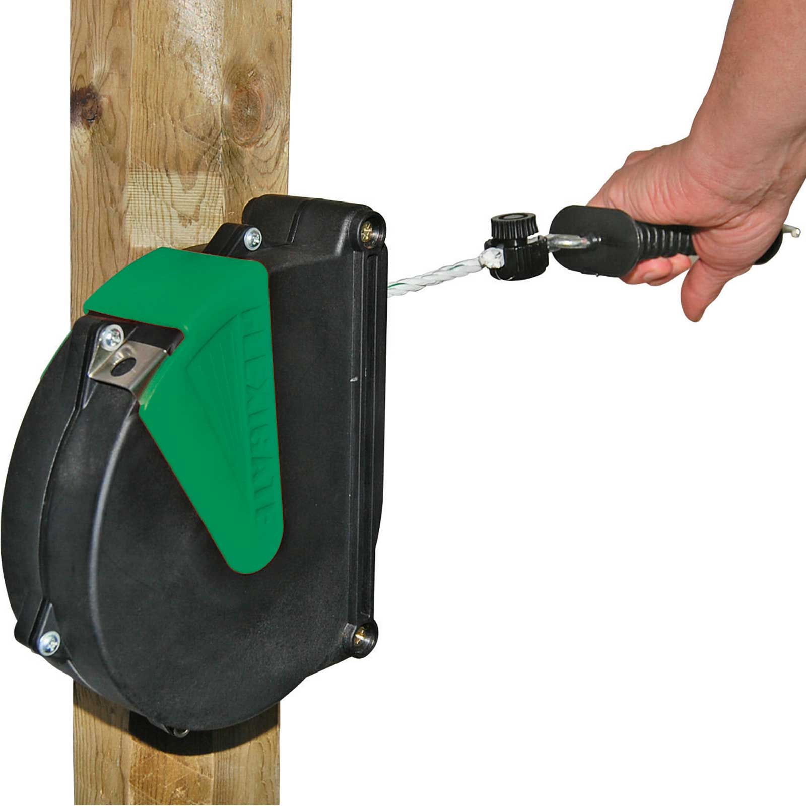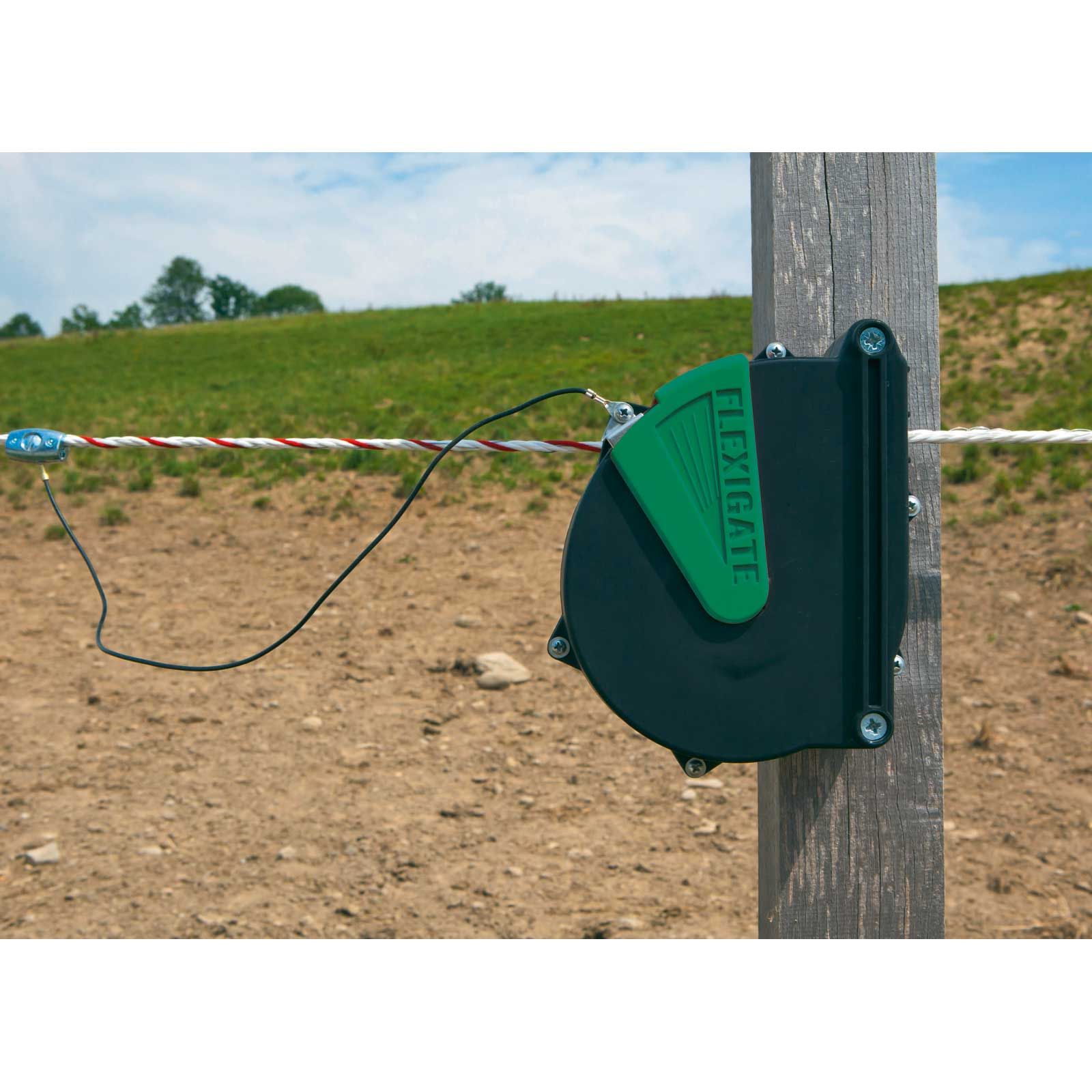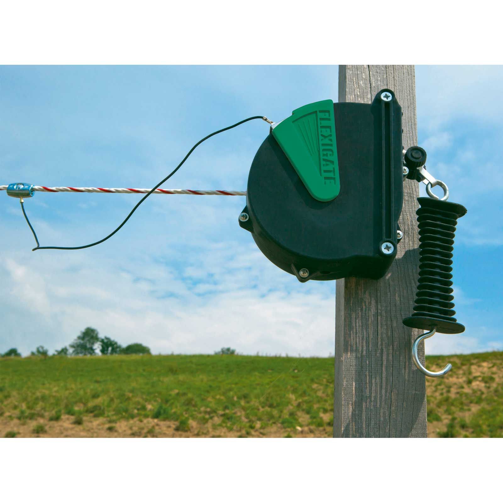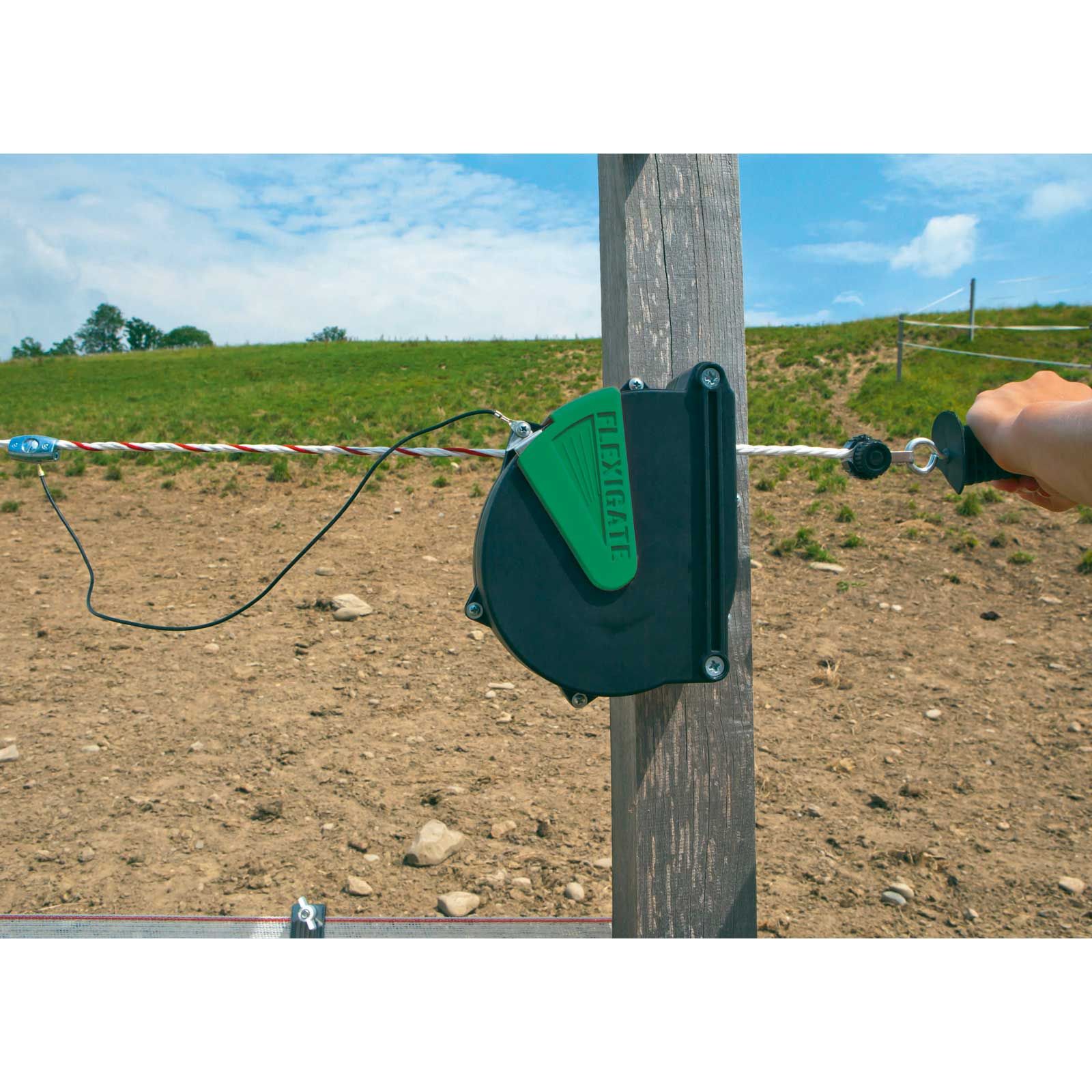 Mit dem Flexigate Torsystem können Sie Koppeleingänge bei Ihrem Weidezaun einfach und bequem unter Strom setzen. Bei jedem Öffnen wird das Elektroseil von einer Stahlfeder eingerollt.