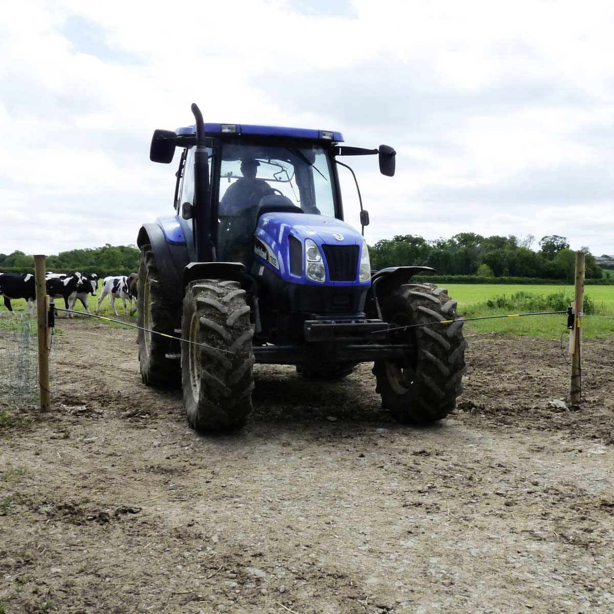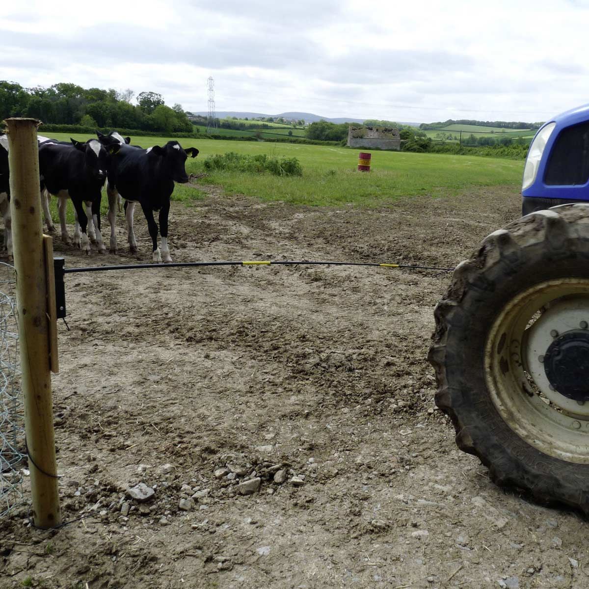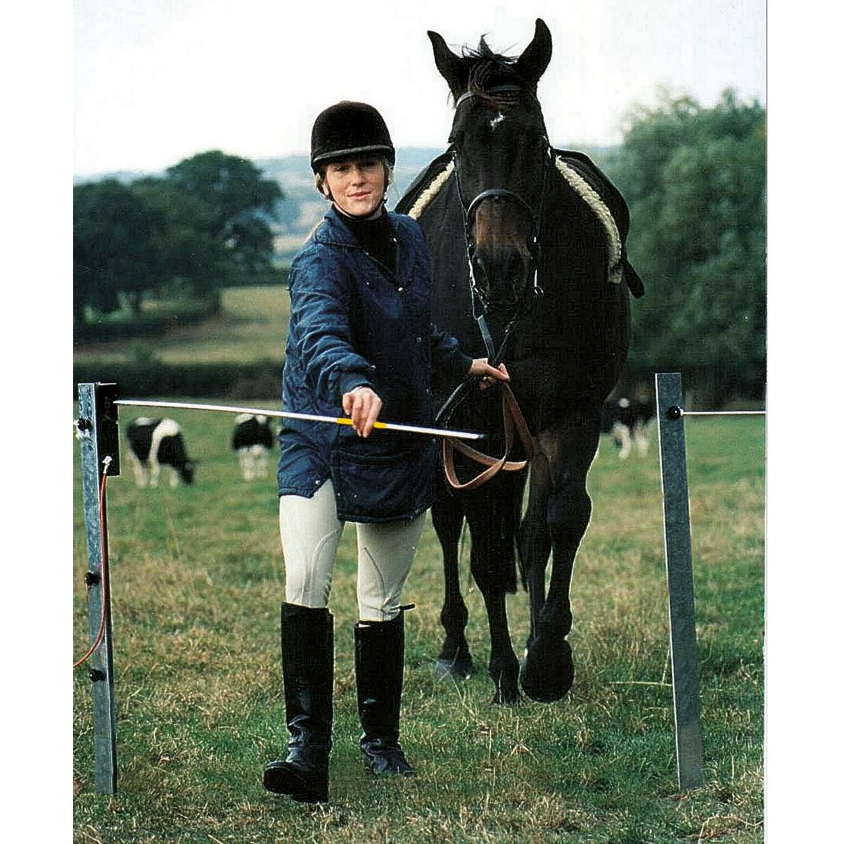 Die praktische Viehschranke Elektro Gate bietet mit seiner Länge von 6 m einen optimalen Ausbruchschutz bei breiten Wegen und Straßen. Das Set, bestehend aus zwei Stäben, zwei Schanieren und einem isolierten Erdkabel, kann leicht in bestehende Zaunanlagen eingesetzt werden. Die flexiblen Fiberglasstäbe sind mit elektrisch leitfähigem Gummi überzogen. Durch kleine leitende Graphitteilchen, die in das Material eingearbeitet sind, wird der Gummi leitend gemacht. Isolierte Handgriffe ermöglichen ein ungefährdetes Durchqueren von Fußgängern und Wanderern. Das physikalische Prinzip des Faradayschen Käfigs bewahrt den Fahrer im Fahrzeug vor elektrischen Schlägen. Die Viehschranke kann in beide Richtungen geöffnet werden und schließt selbstständig, die Stäbe können jedoch im geöffneten Zustand festgestellt werden.