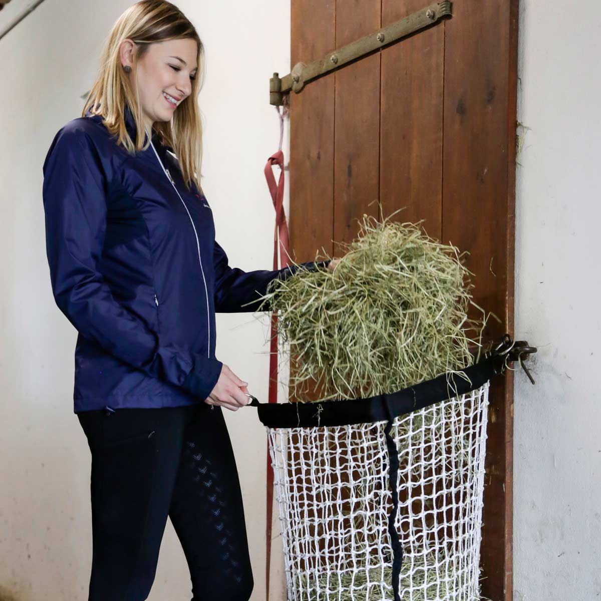 Rechteckiges Heunetz mit praktischem Aufhängehaken zum einfachen Befüllen. Ein verstärkter Klettverschuss an der Öffnung des Heunetzes verhindert das ungewollte Öffnen des Heusackes durch das Pferd. Die extra kleinen Fessöffnungen 3x3 cm sorgen für ein langes Fressvergnügen und eine optimale Futteraufnahme beim Tier.
