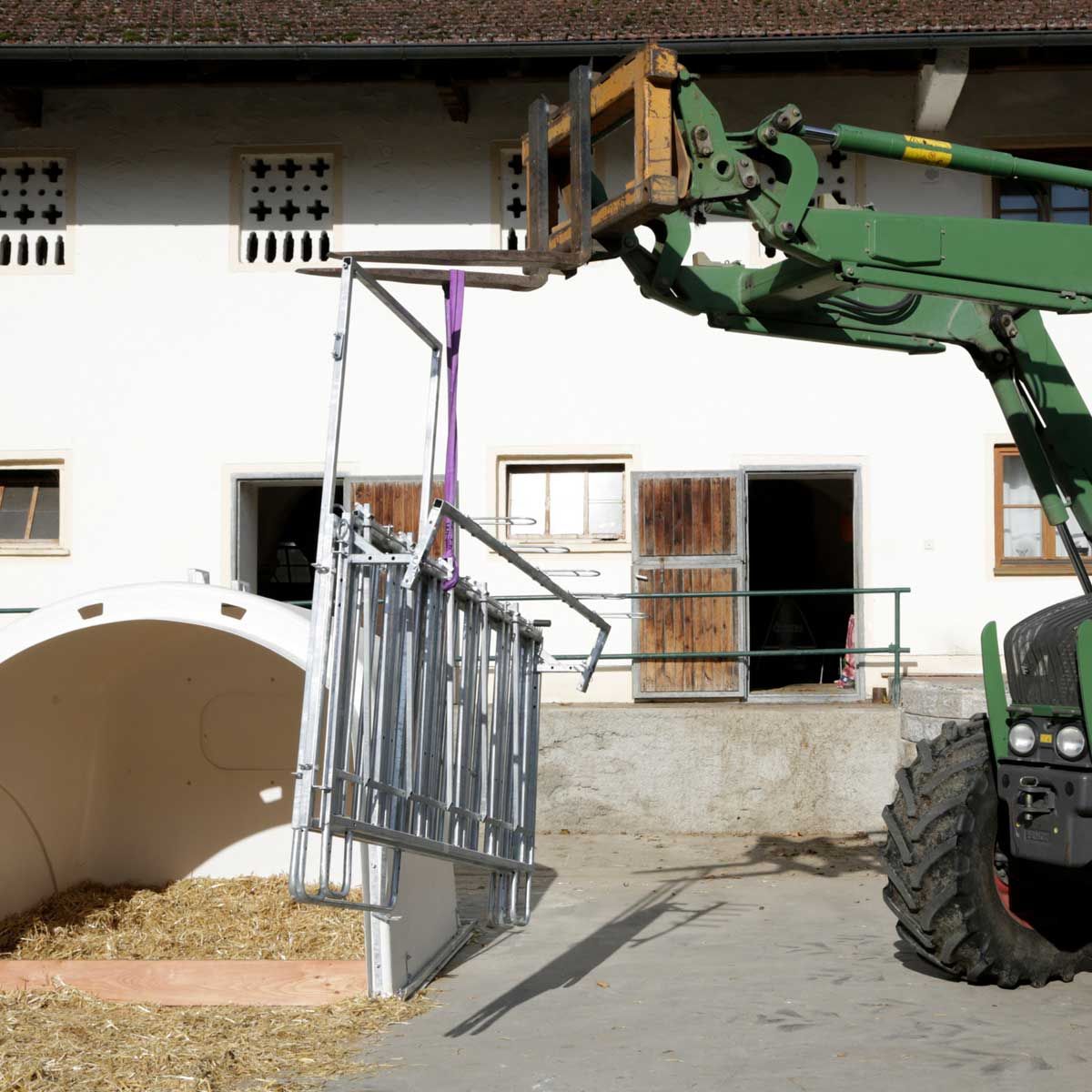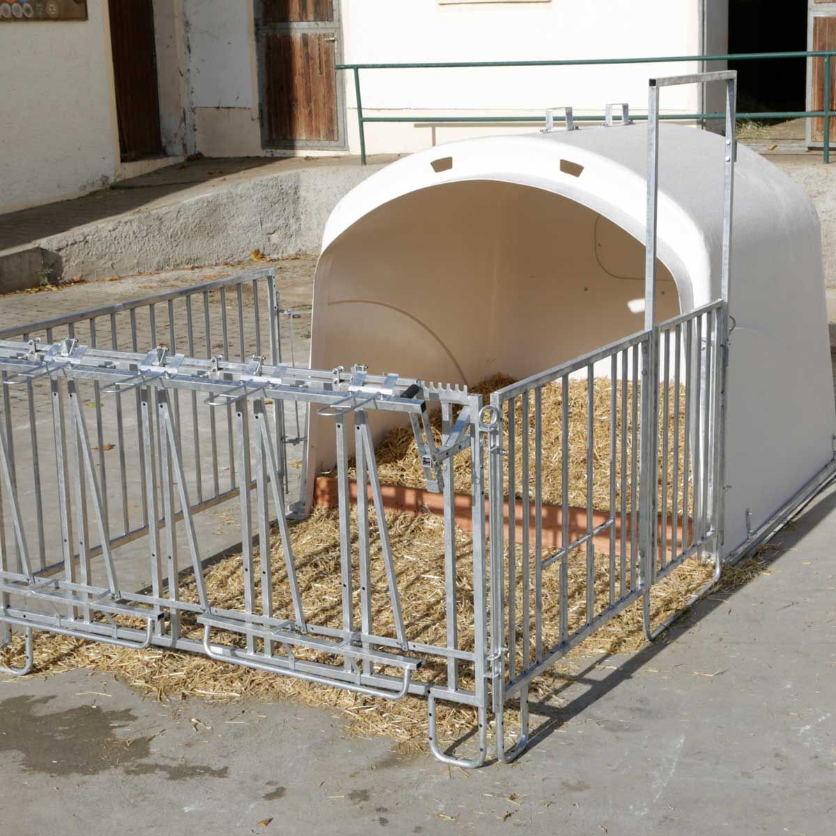 Die große Eingangstür sorgt für optimalen Zugang, auch Kälberwägen passen durch die Türe. Die Kälberhütte ist sowohl mit einer Umzäunung, als auch mit einem Fanggitter lieferbar.