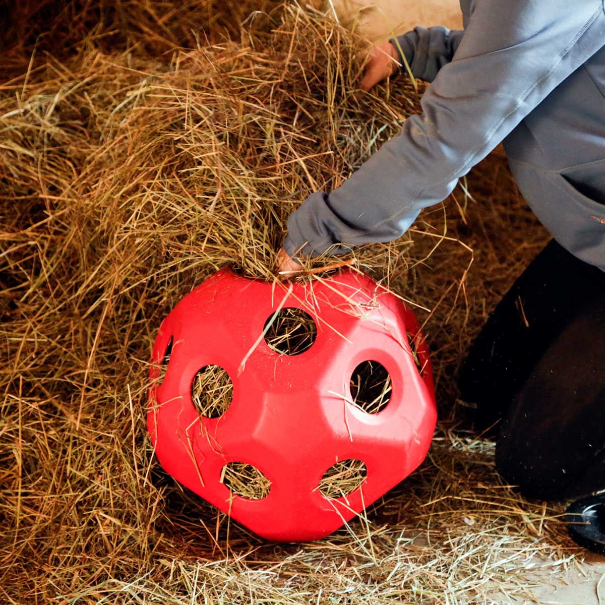 Der Futterspielball ist bestens für die Verwendung im Stall, auf der Weide oder Paddock geeignet. Großpferde, Kleinpferde wie auch Kälber können das Heu aus 19 Fressöffnungen zupfen und sind so gut beschäftigt. Der stabile, UV-beständige Kunststoff kann mit bis zu 3 kg Heu befüllt werden. Die Befüllung ist über die 116 mm große Befüllöffnung mit Schraubverschluss möglich. Der Ball kann auch an einem Seil oder einer Kette aufgehängt werden. Gerade Kälber beschäftigen sich gerne mit dem schwingenden Ball.