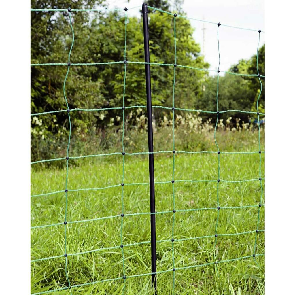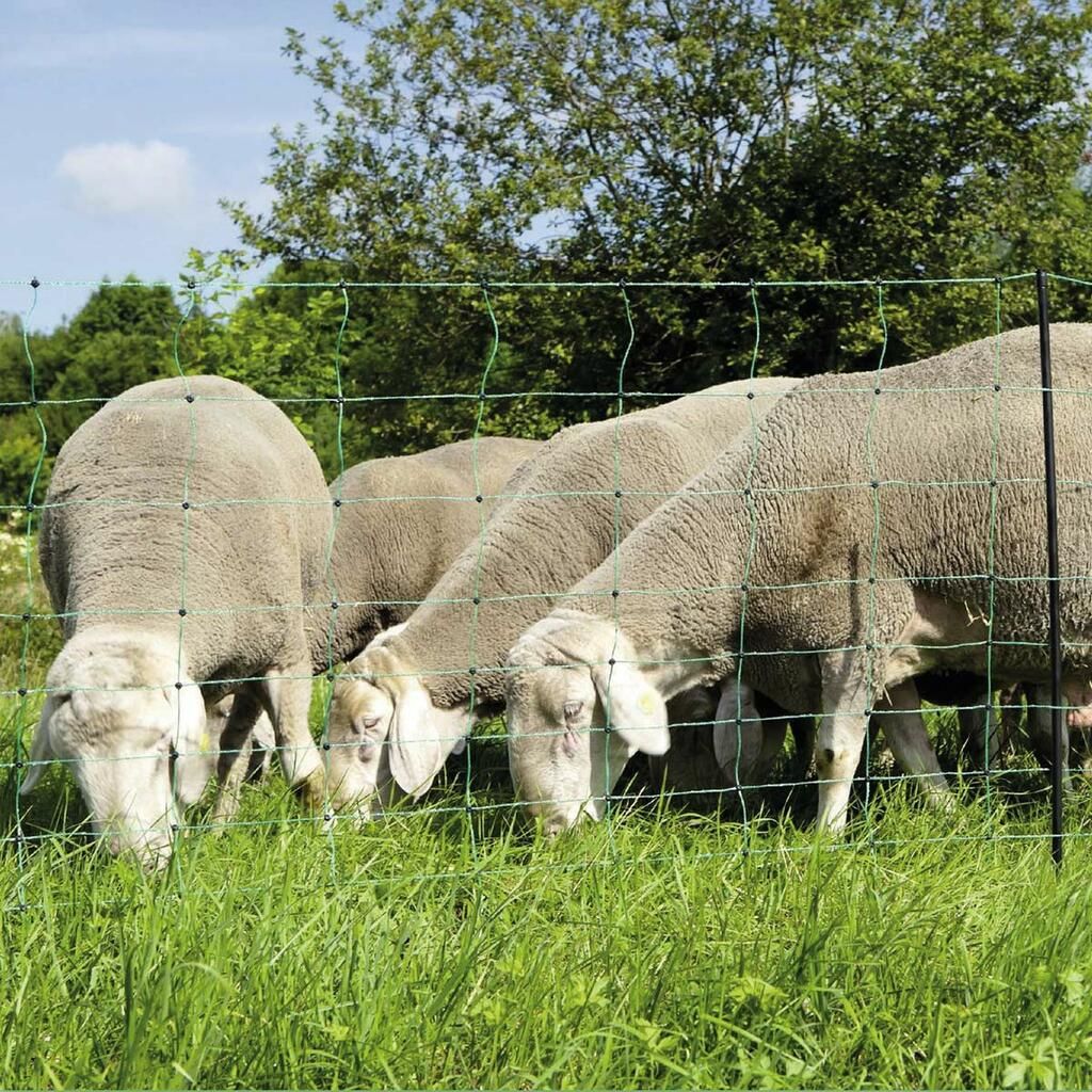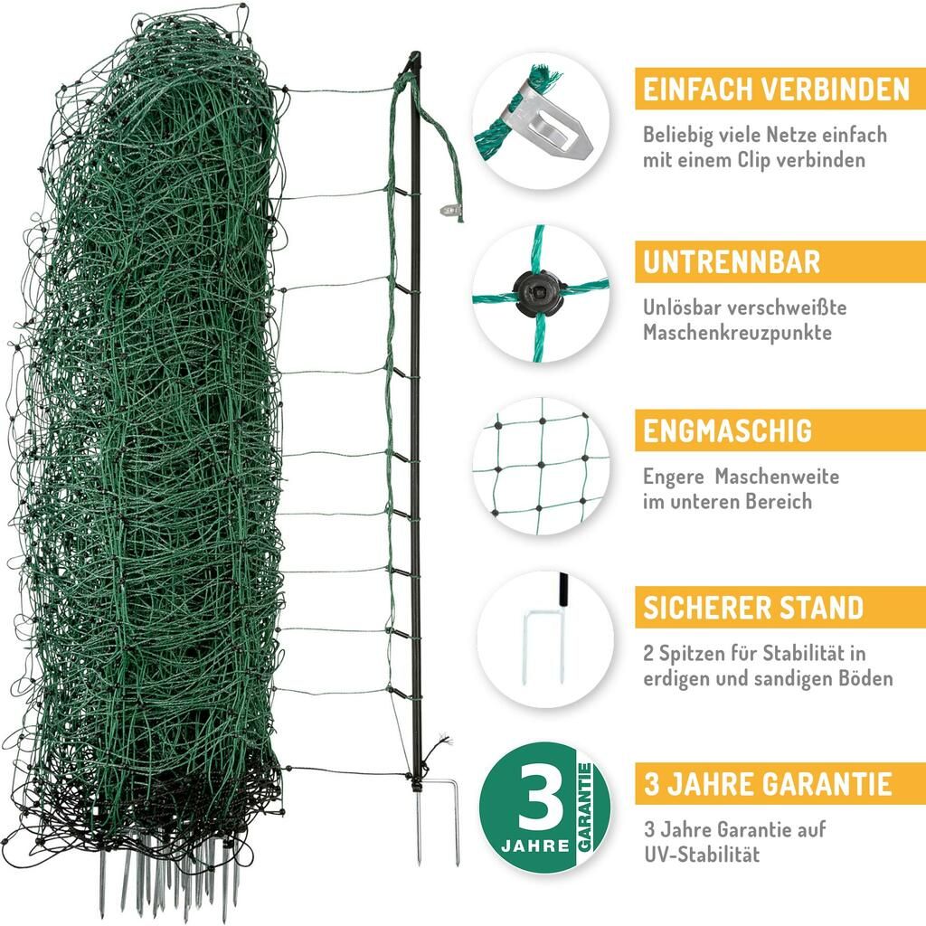 Das Komplett-Set beinhaltet auch ein grünes 50 m Ziegennetz. Das robuste Netz ist 108cm hoch und wird von 14 Kunststoffpfählen mit Doppelspitze gehalten. Diese Doppelspitze sorgt im Vergleich zu einer einfachen Spitze für mehr Stabilität in erdigen & sandigen Böden. Von den neun Kunststofflitzen sind die oberen acht stromführend. Die Bodenlitze ist nicht stromführend, um den Stromfluss durch Gräser nicht zu unterbrechen. Das Ziegennetz hat besonders enge Maschen, die den Ausbruch Ihrer Weidetiere zusätzlich erschweren. Für die Einzäunung größerer Weideflächen können Sie das Weidenetz leicht mit anderen Netzen erweitern. Ein optimaler Stromfluss ist auch bei mehreren aneinandergereihten Elektronetzen bis zu einer max. Länge von ca. 600 m gegeben (ohne Bewuchs).