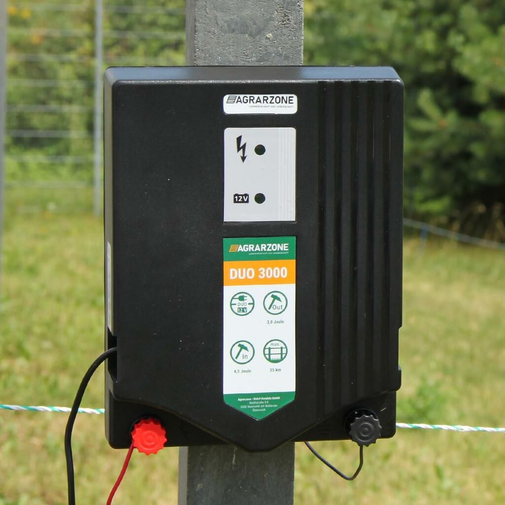 Besonders hütesicher ist der Ziegenzaun durch das schlagstarke Weidezaungerät DUO 3000. Sie können das Gerät sowohl stationär mit 230 V, als auch besonders flexibel mobil einem 12 V AGM Akku (AGM 88-110Ah, nicht im Lieferumfang enthalten) betreiben. Dank der vielfältigen Nutzungsmöglichkeiten kann bei Bedarf auch ein 25 Watt Solarmodul an dem Weidegerät angeschlossen werden.