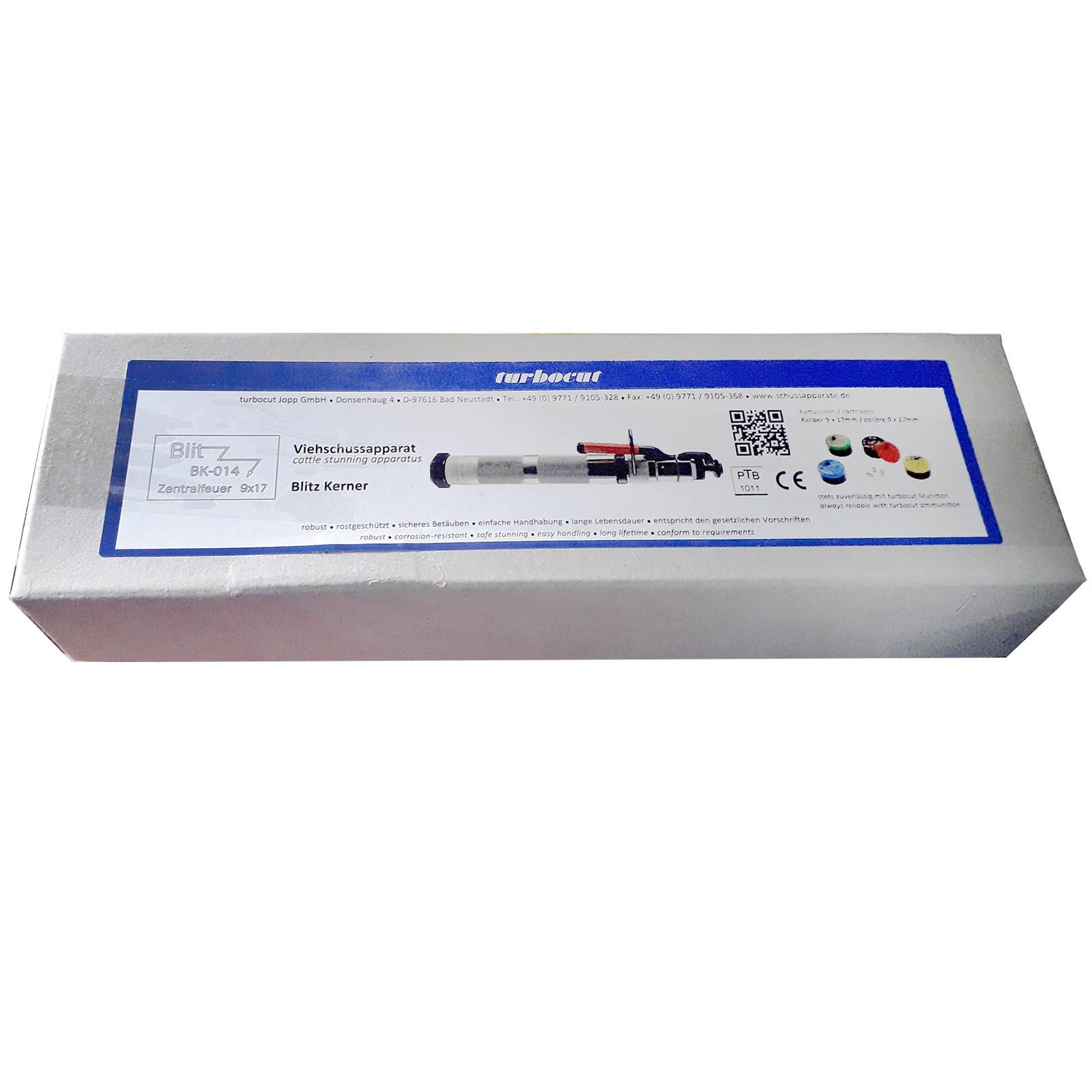 Der Apparat ist speziell für Zentralfeuerkartuschen (zugefaltet und wasserdicht abgedichtet, Kaliber 9x17) eingerichtet - nur diese Kartuschen dürfen verwendet werden. Für die verschiedenen Schlachttierarten stehen die Kartuschen in den verschiedenen Ladungsstärken zur Verfügung. Der jeweiligen Auswahl nach Art und Größe der Tiere ist besondere Beachtung zu schenken. Die Wahl der richtigen Patronenstärke zum jeweiligen Schlachttier sichert die artgerechte Betäubung und hilft den Verschleiß von Schussbolzenfeder und Gummipuffer zu reduzieren. Der Aufdruck, die Farbe des Etiketts sowie die Farbe der Zündhütchen kennzeichnen die Ladungsstärke der Kartusche.