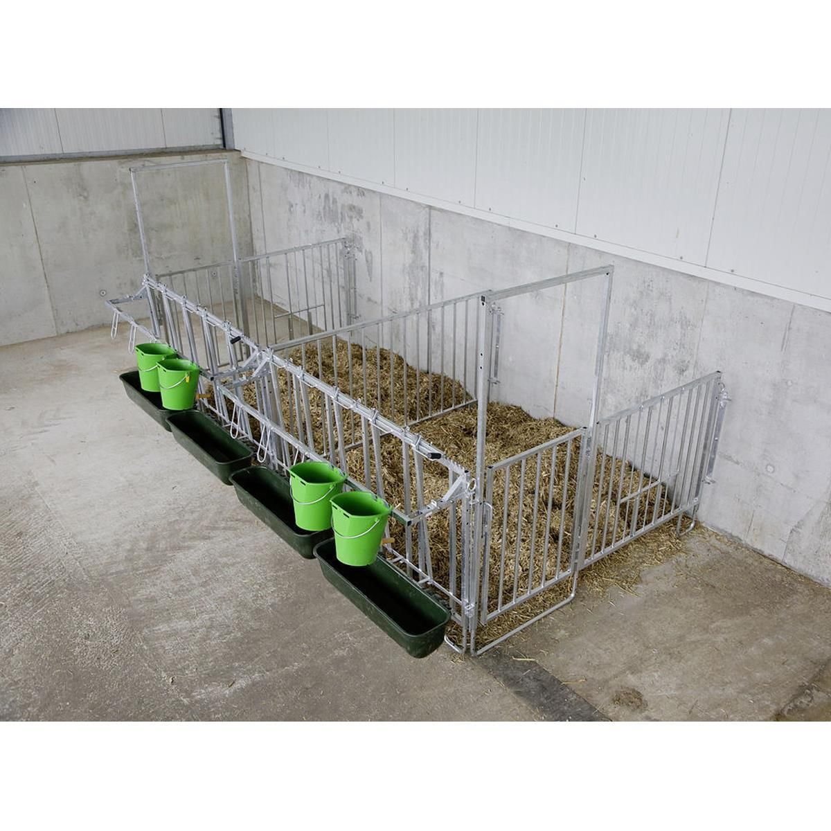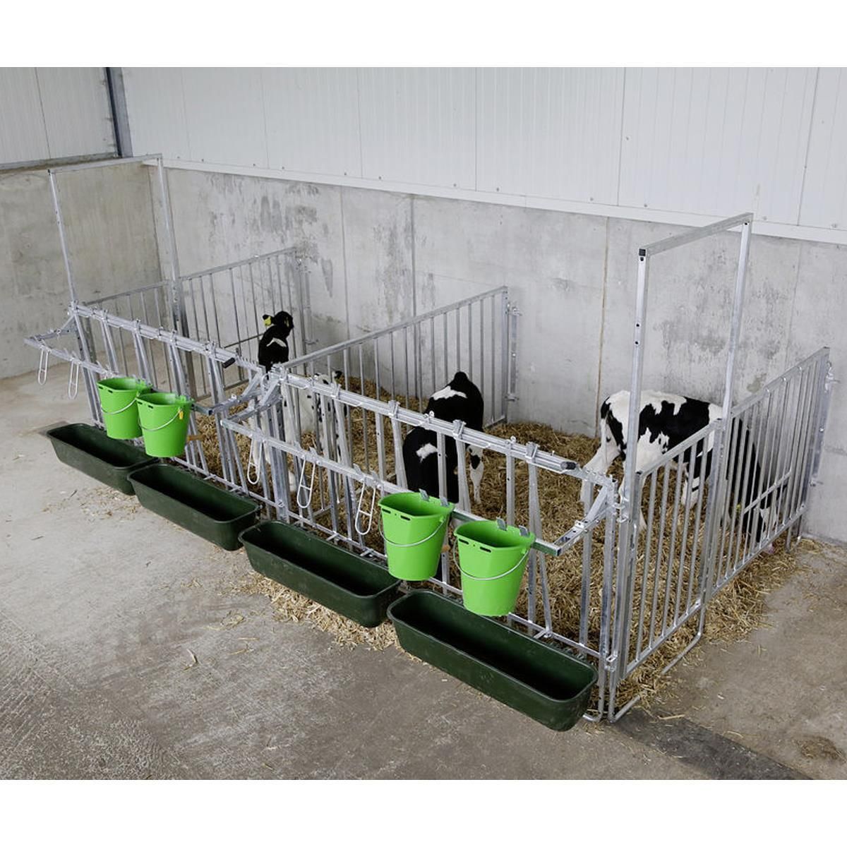 Zur Haltung der Kälber in einer Halle oder überdachtem Bereich, kann die Umzäunung einfach mittels einer Wandhalterung an der Wand befestigt werden. Oder die Umzäunung wird am Boden verankert. Individuell kann die Umzäunung je nach Anforderungen zusammengestellt werden.