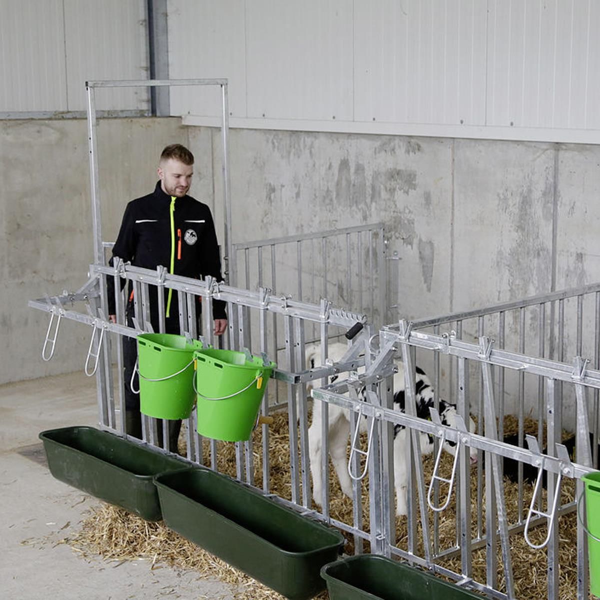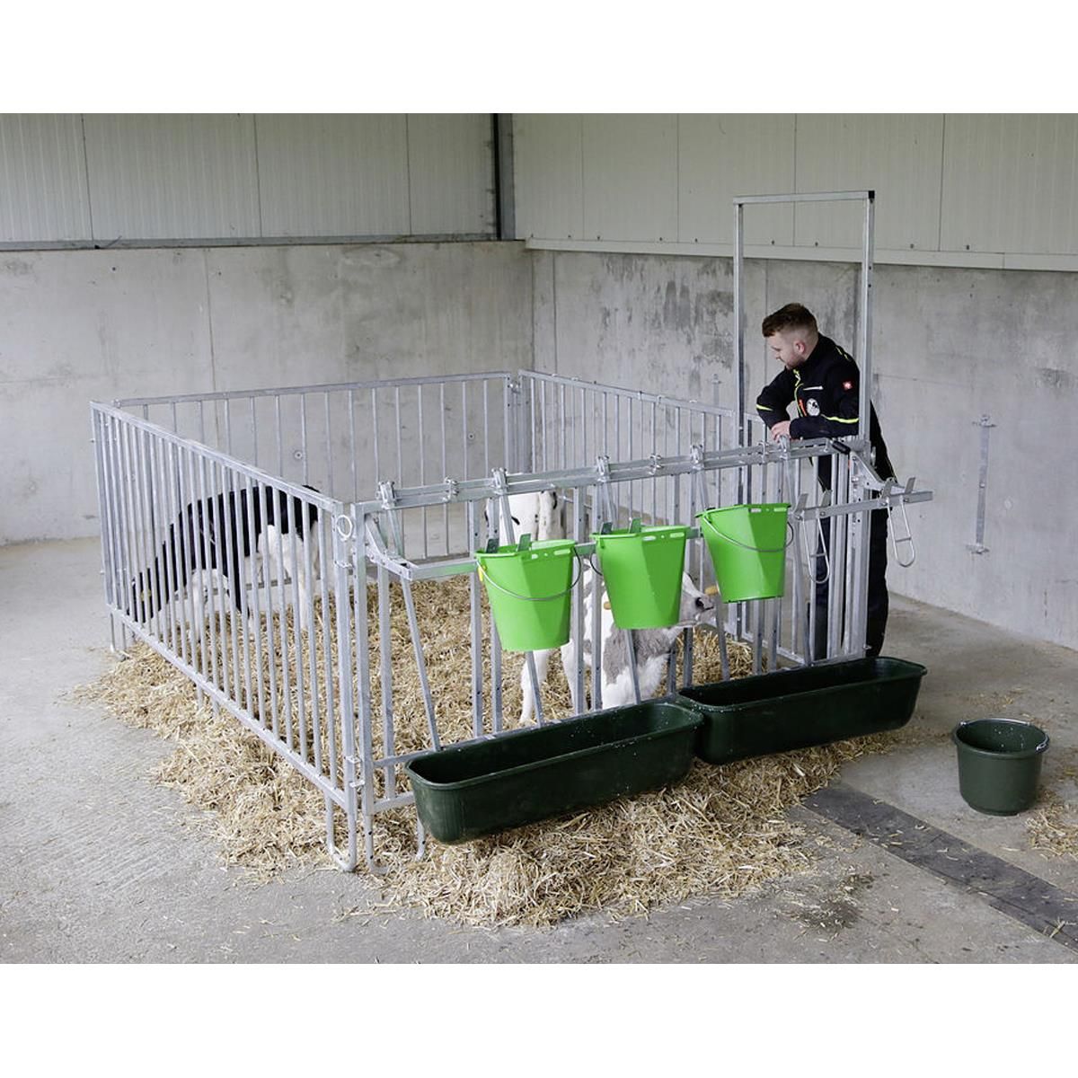 Zur Haltung der Kälber in einer Halle oder überdachtem Bereich, kann die Umzäunung einfach mittels einer Wandhalterung an der Wand befestigt werden. Oder die Umzäunung wird am Boden verankert. Individuell kann die Umzäunung je nach Anforderungen zusammengestellt werden.