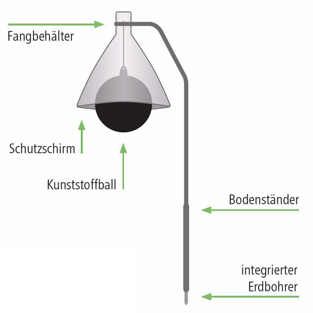 Der schwarze große Lockball in der Mitte der Falle wird durch die Sonne erwärmt und von der Feder sowie dem Wind in eine leichte Bewegung versetzt. So täuscht der Gummiball ein Lebewesen vor. Sobald die Bremse versucht in den stichfesten Ball zu stechen, prallt sie von diesem ab. Da Bremsen nur nach oben wegfliegen können, wird sie durch den weißen Fangschirm trichterförmig zu dem mit Wasser befülltem Fangbehälter geleitet, in dem sie dann ertrinkt.