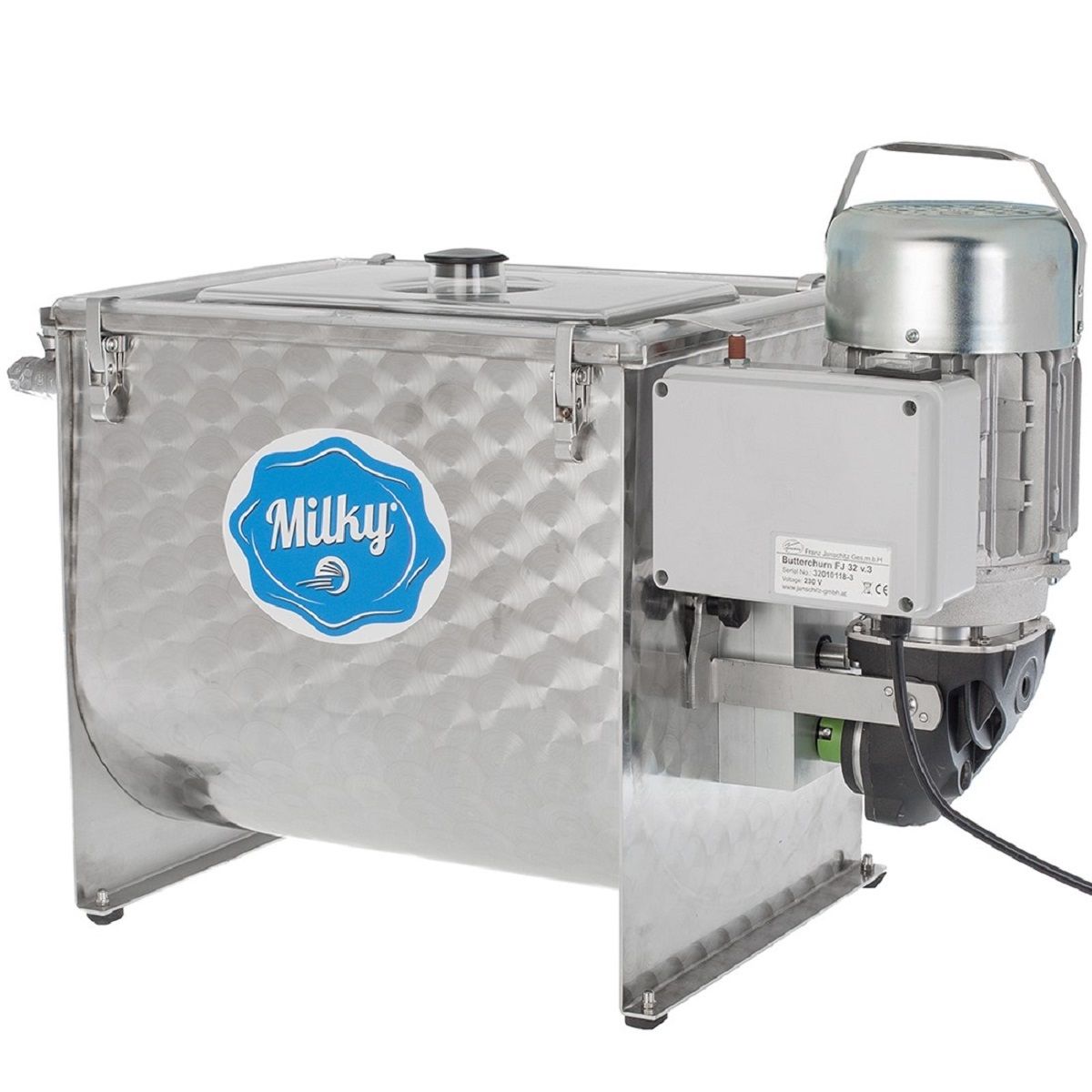 Die elektrische Milky ButtermaschineFJ 32 / 230 V für den professionellen Einsatz! Ja nach Rahmtemperatur und Fettgehalt der Milch benötigt die Milky FJ 32 für einen Vorgang zwischen 20 und 35 Minuten. Füllen Sie 6 bis 13 Liter Rahm in den 32 Liter Edelstahl-Behälter (max. bis zur Rührwerkachse des abnehmbaren Rührwerks aus Edelstahl) und beginnen Sie mit dem Buttern.