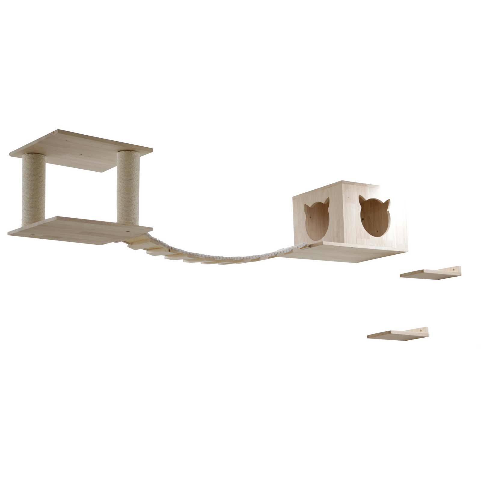 Gestalten Sie eine ganz individuelle Kletterwand für Ihren Stubentiger. Platzieren Sie die 5 Elemente einfach nach Ihrem Geschmack und bieten Sie Ihrer Katze damit viele Kratz- und Spielmöglichkeiten. In diesem Set erhalten Sie eine gemütliche Höhle mit kuscheligem Kissen, eine Liegefläche mit Sisalsäulen die zum Kratzen einladen sowie eine Hängebrücke und zwei Trittstufen zum Erreichen des Katzenspielplatzes.