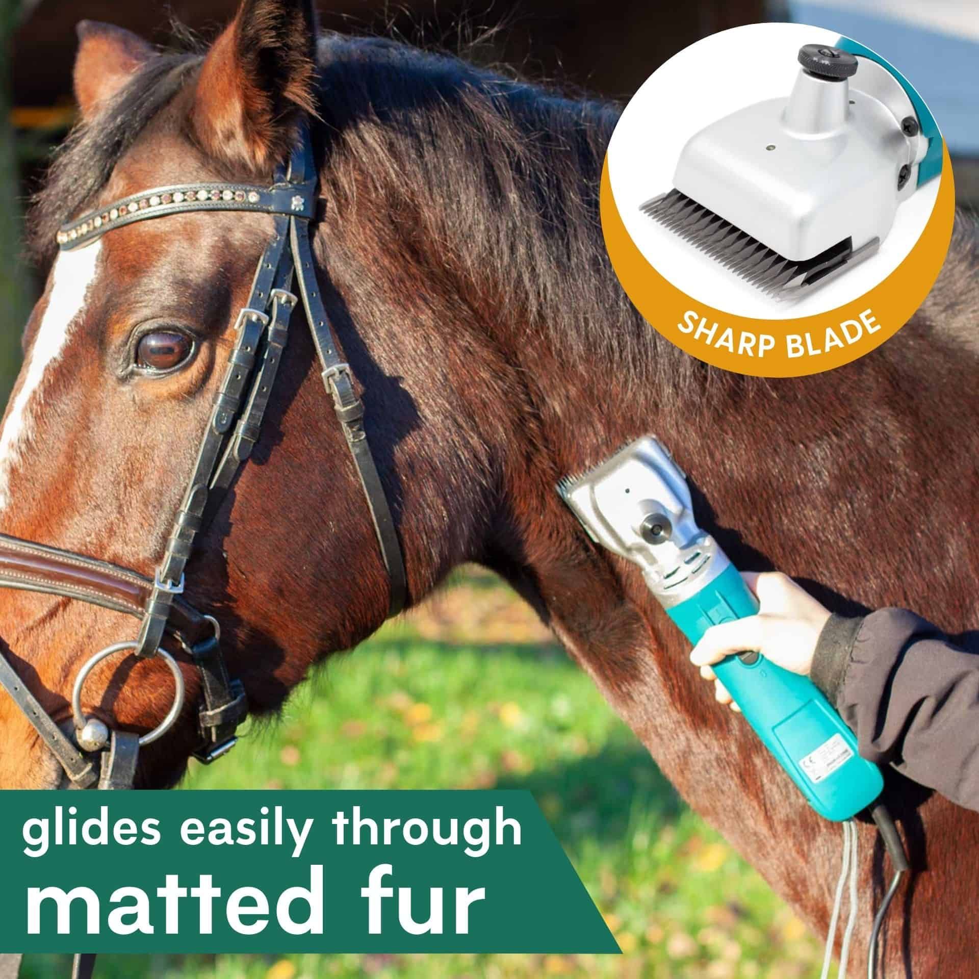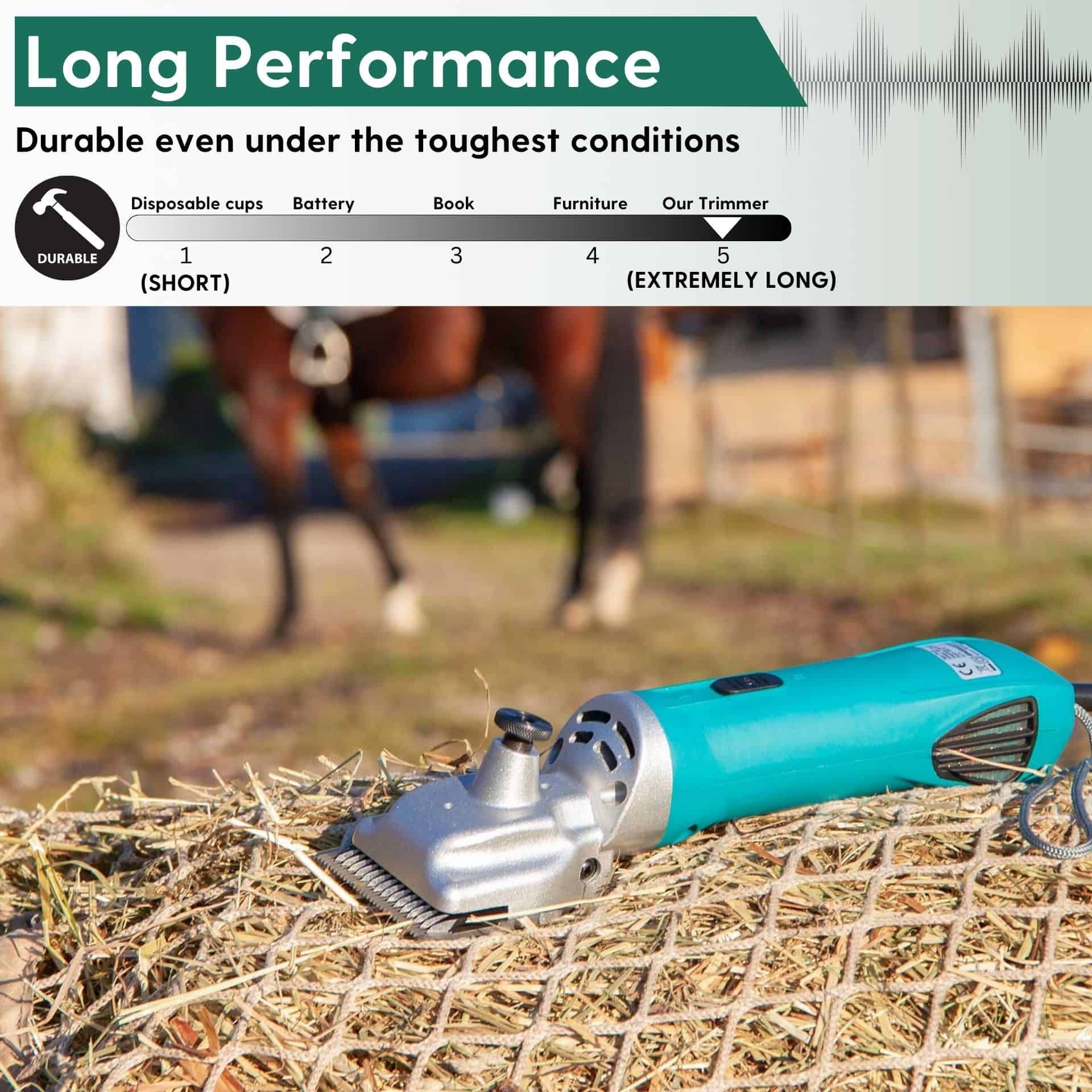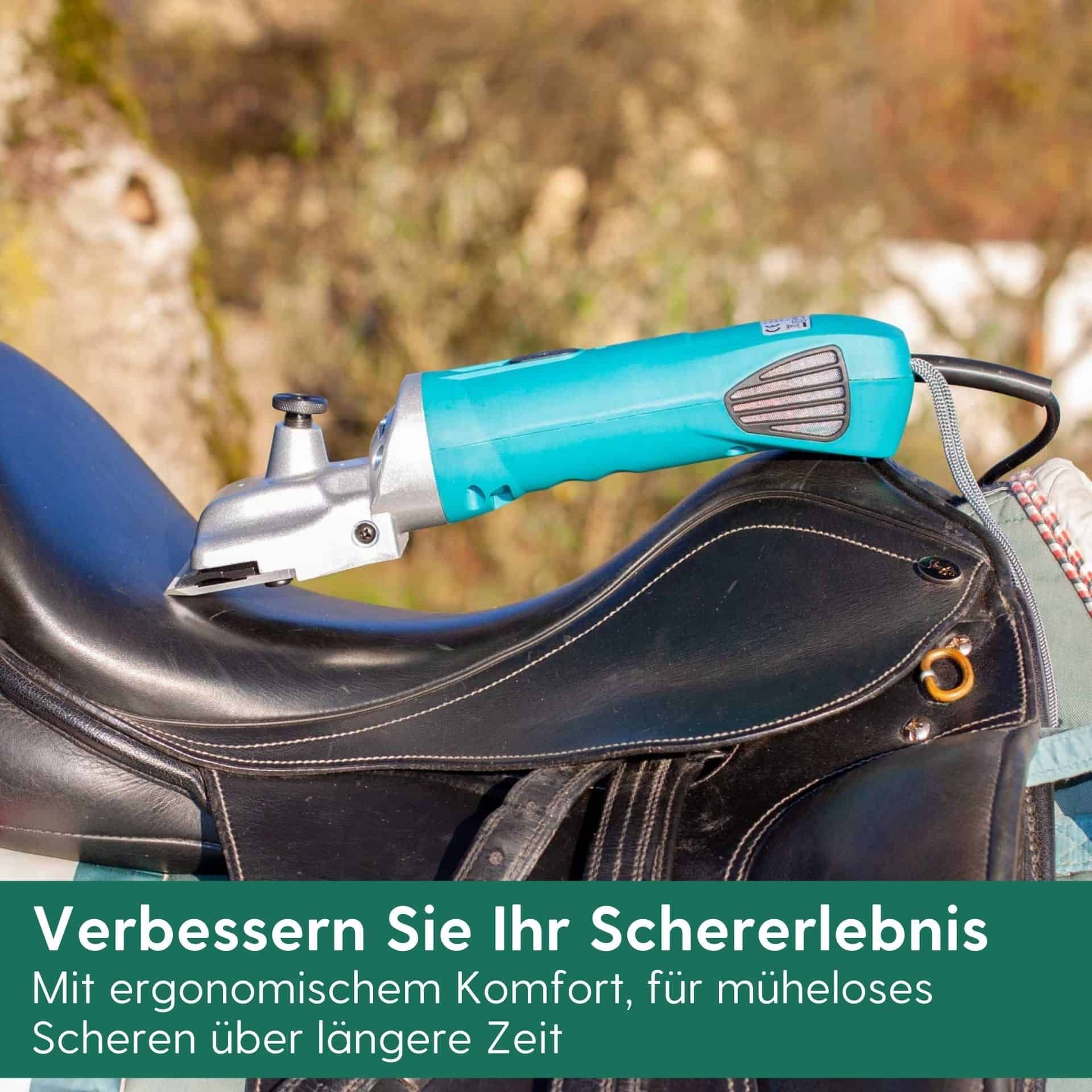 Die Rinder- und Pferdeschermaschine wird mit Netzstrom betrieben und bietet dank einem 3 Meter langen Netzkabel genügend Bewegungsraum. Sie ist ergonomisch geformt und liegt somit sicher in der Hand. Das robuste Gehäuse verspricht eine lange Lebensdauer und optimale Arbeitsbedingungen.