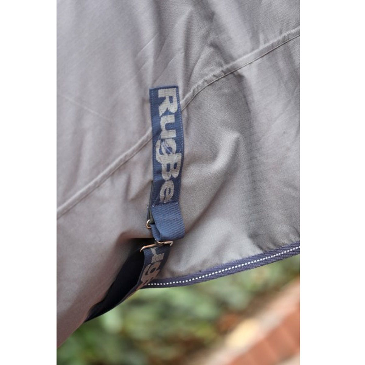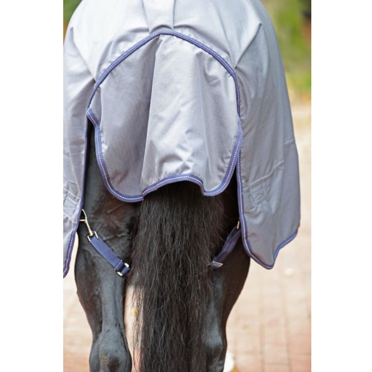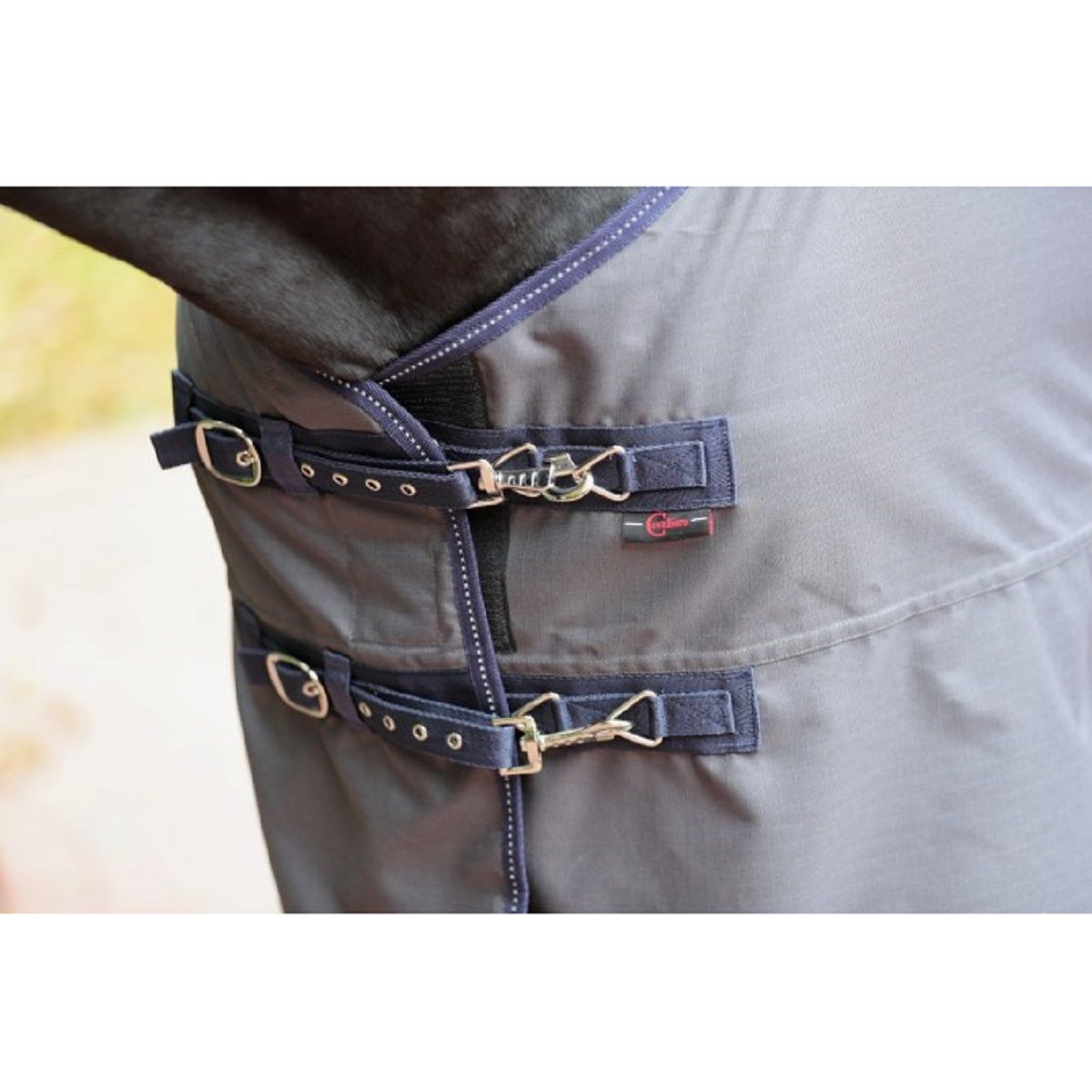 Die hochwertige Weidedecke im klassischen Schnitt ist mit einer Kreuzbegurtung am Bauch, mit einem Schweiflatz, Beinschnüren und einem Widerristpolster aus Synthetikkautschuk ausgestattet. Die überlappende Brustverschnallung hat einen Schnellverschluss durch Metallkarabiner und Dornschnallen.