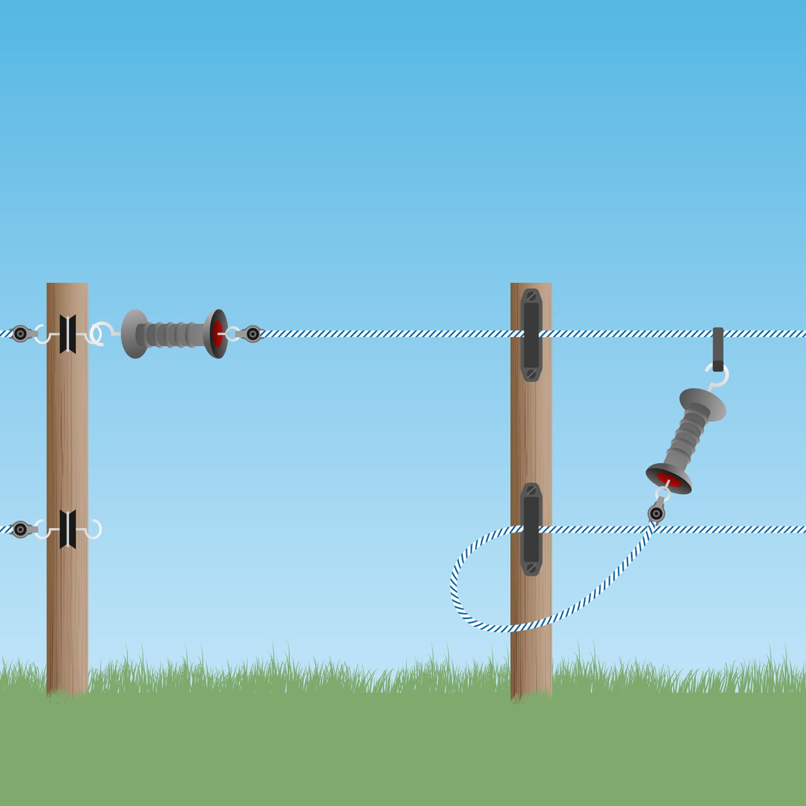 Die Montage des Sets ist ohne viel Aufwand an jedem Holzpfahl möglich. Mittels Fixierschraube am Seil-Schnellverbinder wird die elektrische Verbindung zwischen Leitermaterial und Torgriff bzw. Torisolator hergestellt. Auch zum Nachspannen des Seils ist die Schraube hervorragend geeignet. Die im Lieferumfang enthaltenen Profi Seilisolatoren mit elektrisch leitfähiger Gummieinlage fixieren das Seil sehr schonend aber zuverlässig.
