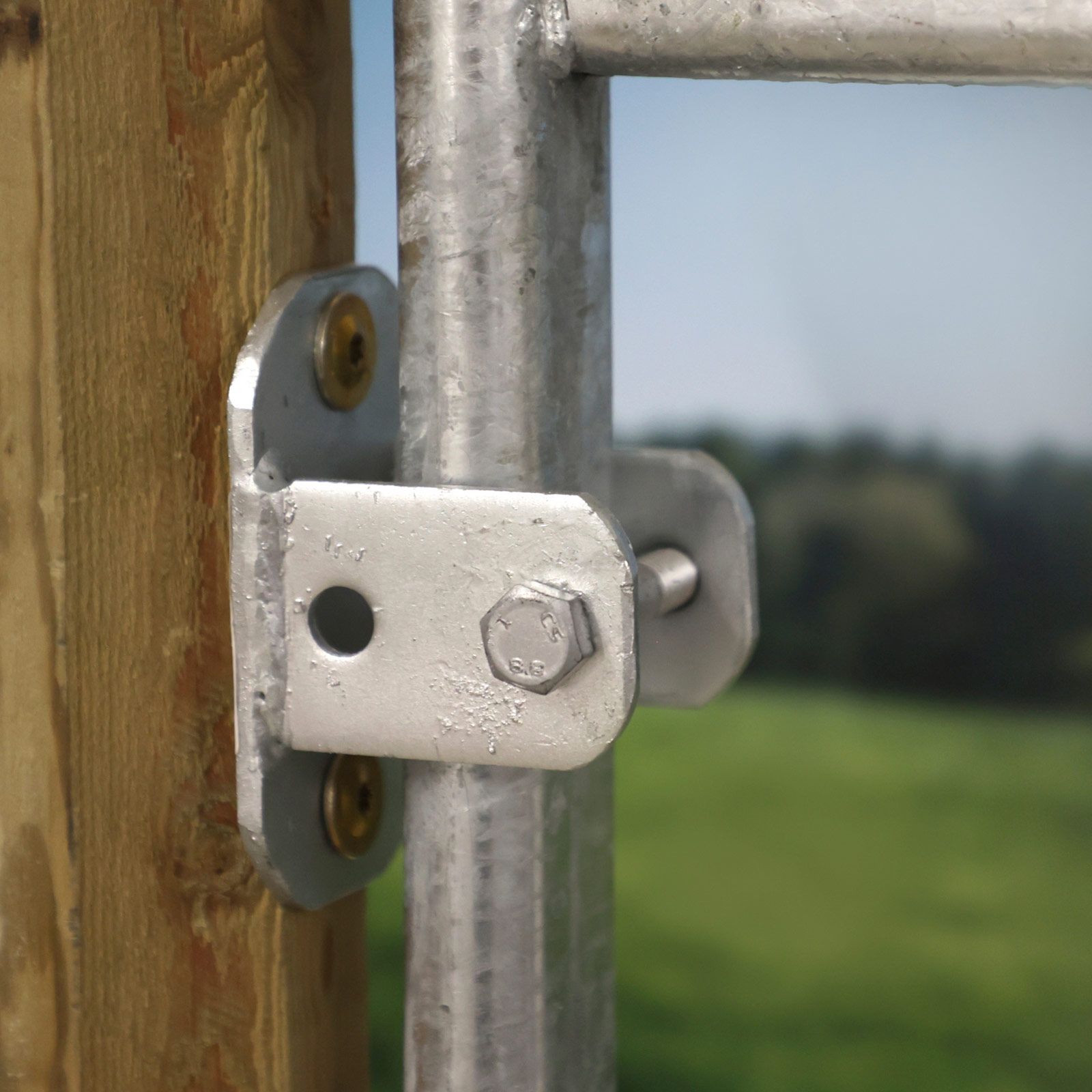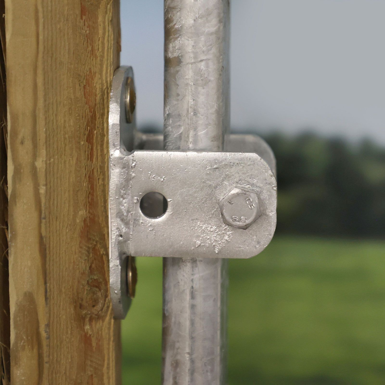 Diese Wand- und Bodenhalterung dient der Anbringung von Weidepanelen an Wand oder Boden. Durch das Weglassen der wandnahen Schraube können die Panele auch leicht schräg fixiert werden, um kleinere Gefälle oder Steigungen im Gelände auszugleichen. Der Anschraubteil ist aus langlebigem, feuerverzinktem Metall gefertigt. Die Montage ist spielend einfach durch Anschrauben an Wand oder Boden möglich.
