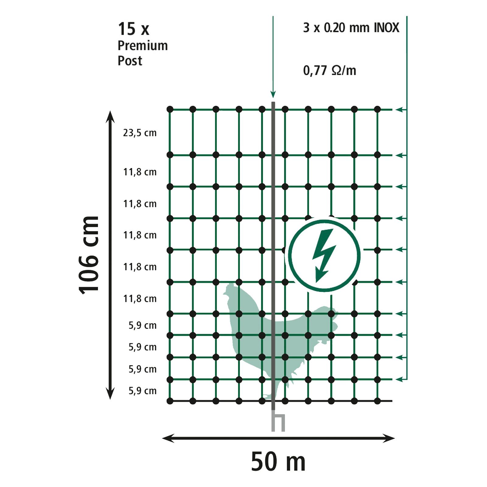 Ako Geflügelnetz Premium Pfahl mit Strom, Doppelspitze, grün 50 m x 106 cm