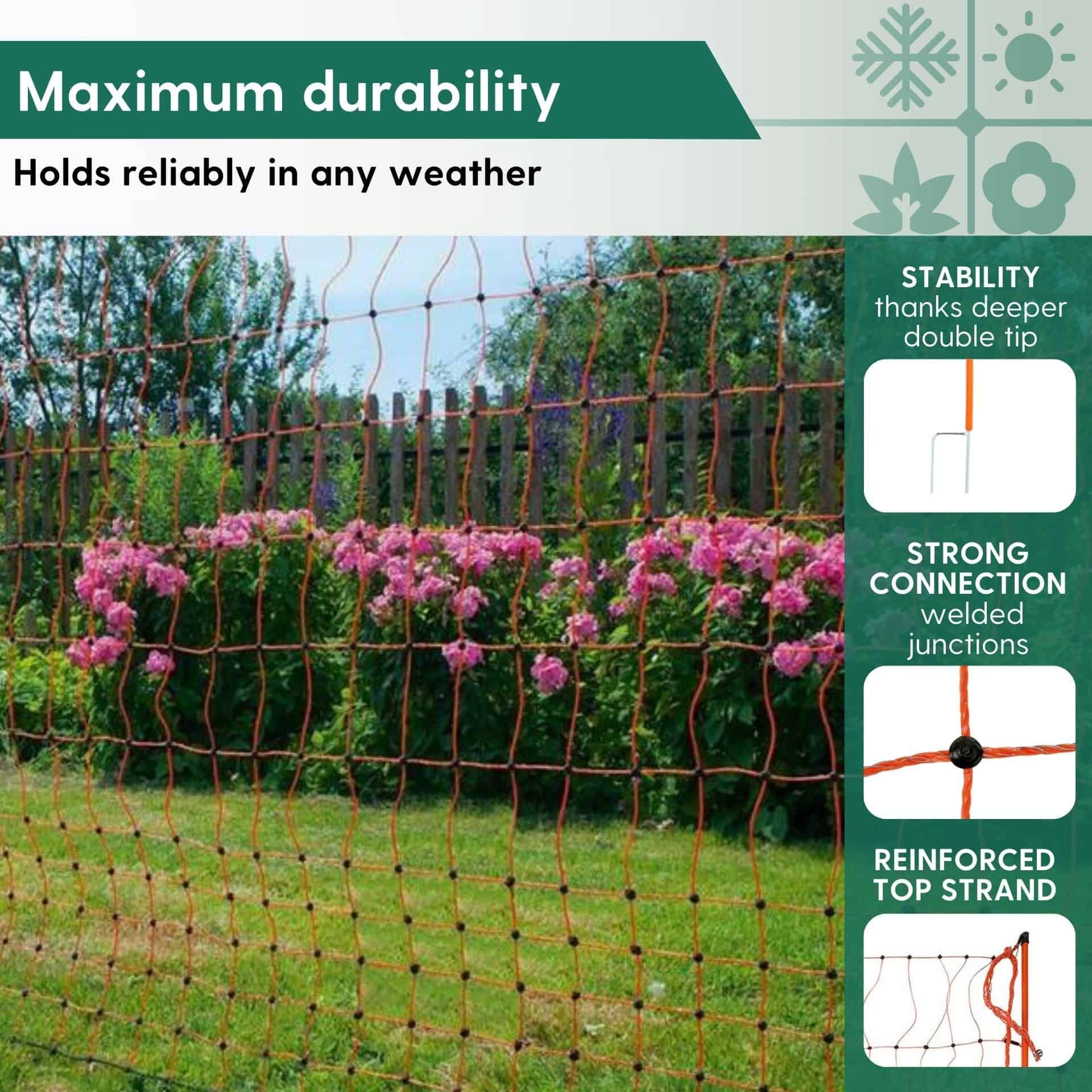Das Hühnernetz verfügt im unteren Bereich über enge Maschen, welche das Netz besonders zum Hüten von Geflügel, wie z.B. Hühner, Puten oder Enten interessant macht. Aber auch andere kleinere Tiere lassen sich mit dem mobilen Zaun hervorragend hüten, wie z.B. Schweine, Ziegen, Hunde oder als Schafnetz. Zusätzlich zu den engeren Maschen wird ein Durchhängen des Netzes mit der verstärkten Oberlitze verhindert. Stabile Kunststoffpfähle mit Doppelspitze sorgen für einen guten Stand des Weidezauns in erdigen oder sandigen Böden. Der Steckzaun ist mit einer orangen Litze ausgestattet, wodurch es besonders gut für Mensch und Tier sichtbar ist. Die Farbe sorgt ebenfalls für eine natürliche Abschreckung und erhöht wirksam die Hütesicherheit. Für die guten Hüteeigenschaften sorgt außerdem eine Kunststoffplombe an jedem Maschenkreuzpunkt, die unlösbar verschweißt ist. Für eine zusätzliche Stabilität empfehlen wir einen Holzpfosten in jede Ecke des Netzes zu setzen.
