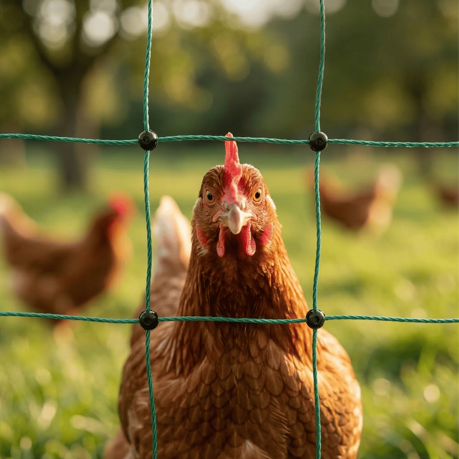 Das Hühnernetz verfügt im unteren Bereich über enge Maschen, welche das Netz besonders zum Hüten von Geflügel, wie z.B. Hühner, Puten oder Enten interessant macht. Aber auch andere kleinere Tiere lassen sich mit dem mobilen Zaun hervorragend hüten, wie z.B. Schweine, Ziegen, Hunde oder als Schafnetz. Zusätzlich zu den engeren Maschen wird ein Durchhängen des Netzes mit der verstärkten Oberlitze verhindert. Stabile Kunststoffpfähle mit Doppelspitze sorgen für einen guten Stand des Weidezauns in erdigen oder sandigen Böden. Für die guten Hüteeigenschaften sorgt zusätzlich eine Kunststoffplombe an jedem Maschenkreuzpunkt, die unlösbar verschweißt ist. Der Steckzaun ist mit einer grünen Litze ausgestattet, wodurch er sich besonders harmonisch in die Umgebung einfügt. Für eine zusätzliche Stabilität empfehlen wir einen Holzpfosten in jede Ecke des Netzes zu setzen.