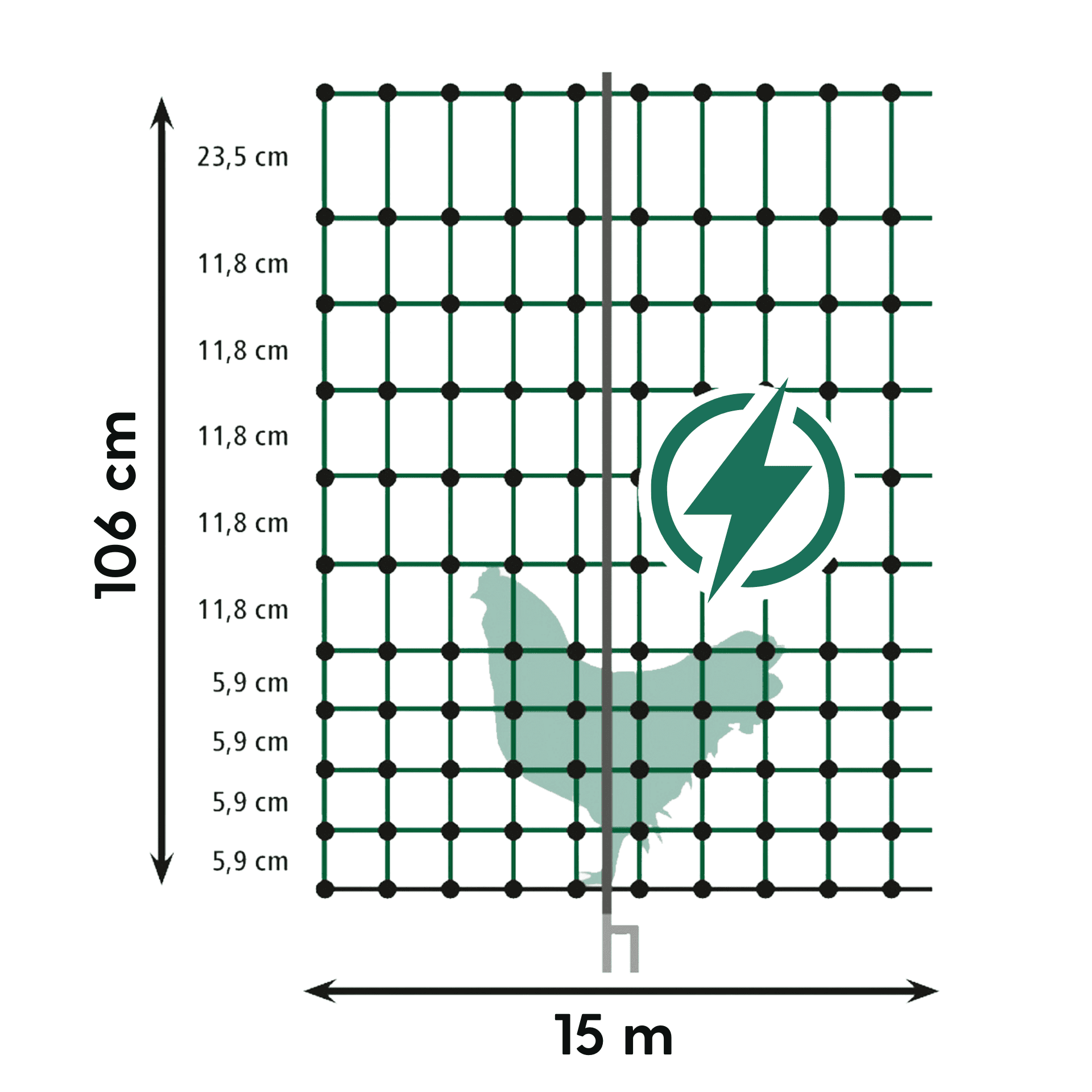 Agrarzone Geflügelnetz Classic mit Strom, Doppelspitze, grün 15 m x 106 cm