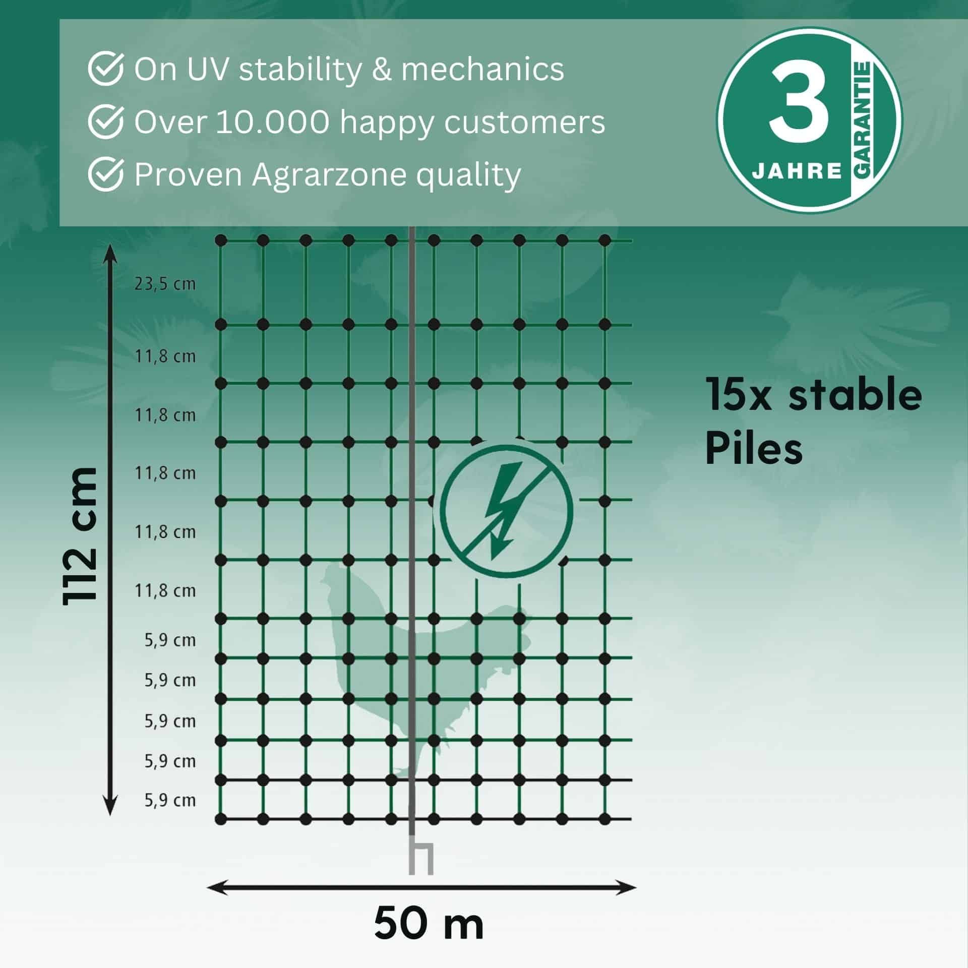 Die stabilen Kunststoffpfähle mit Doppelspitze sorgen für einen guten Stand in erdigen oder sandigen Böden. Für die guten Hüteeigenschaften sorgt zusätzlich eine Kunststoffplombe an jedem Maschenkreuzpunkt, die unlösbar verschweißt ist. Das Geflügelnetz ist mit einer grünen Litze ausgestattet, wodurch er sich besonders harmonisch in die Umgebung einfügt. Für eine zusätzliche Stabilität empfehlen wir einen Holzpfosten in jede Ecke des Netzes zu setzen.