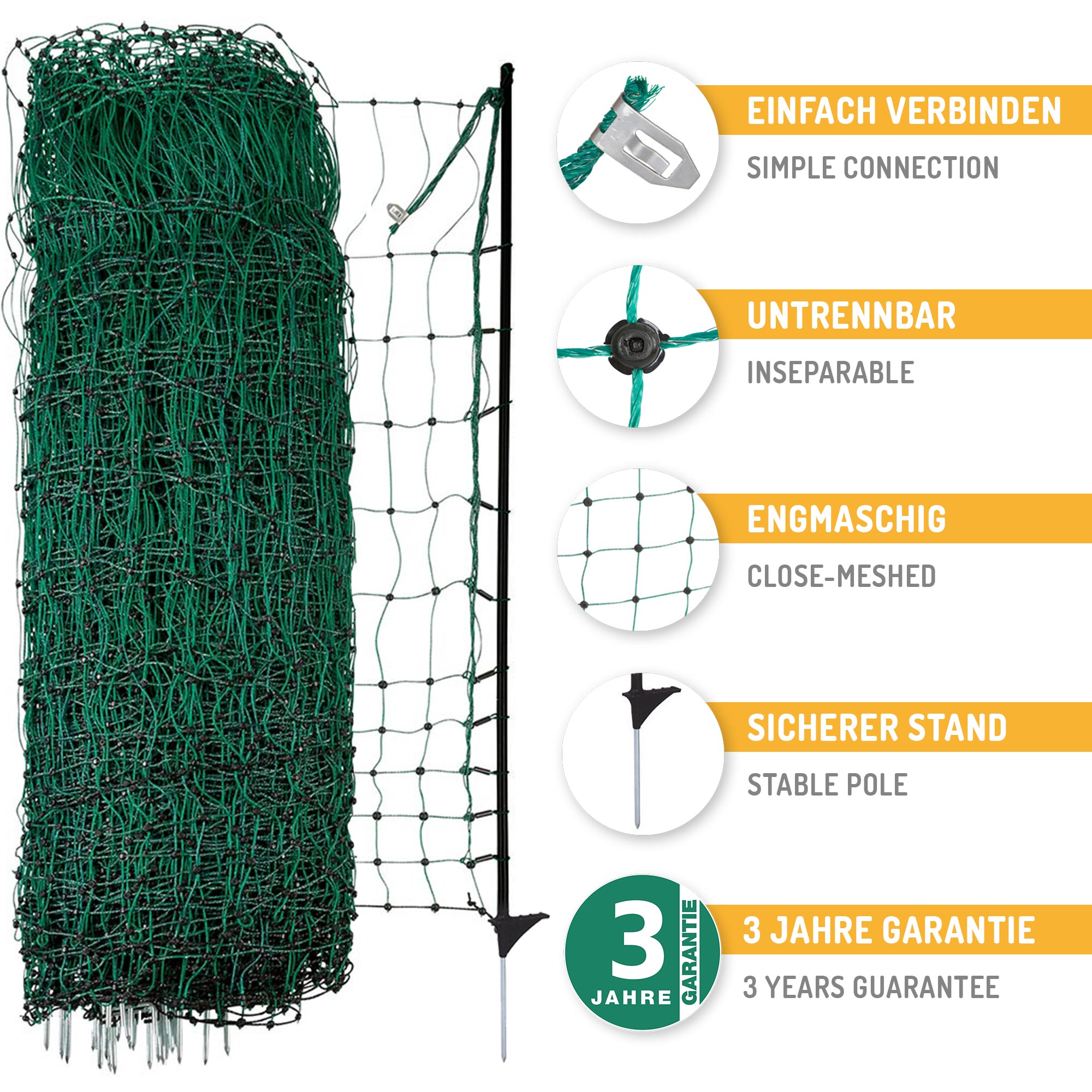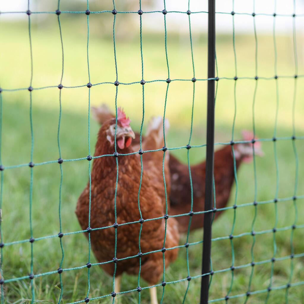 Dieses Geflügelnetz sorgt für extra Standsicherheit dank seiner stabilen und leichten Fiberglaspfähle. Für zusätzlichen Schutz gegen Wildtiere optional mit einem Weidezaungerät elektrifizierbar.