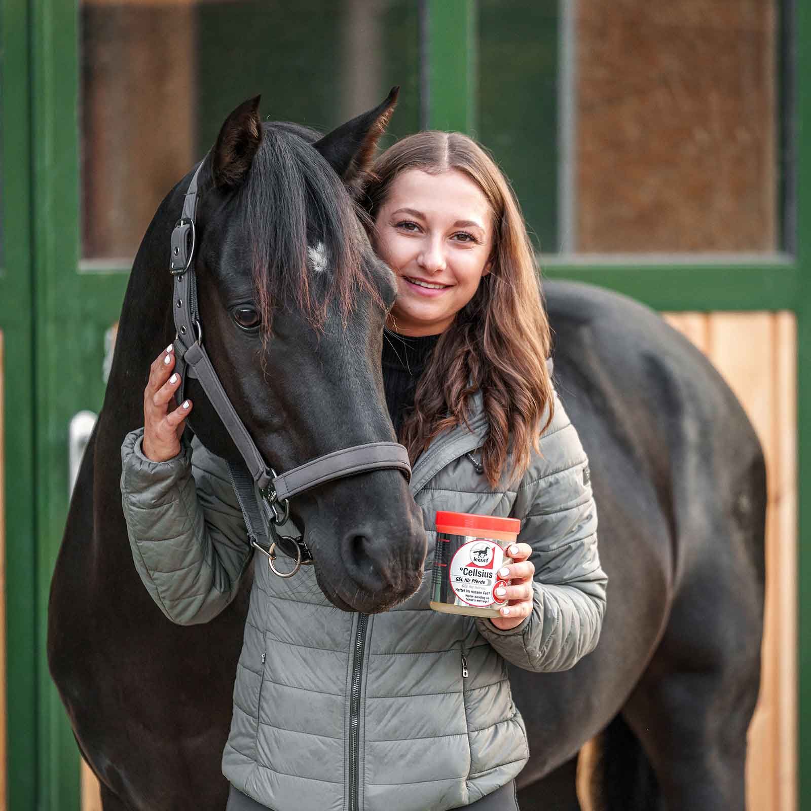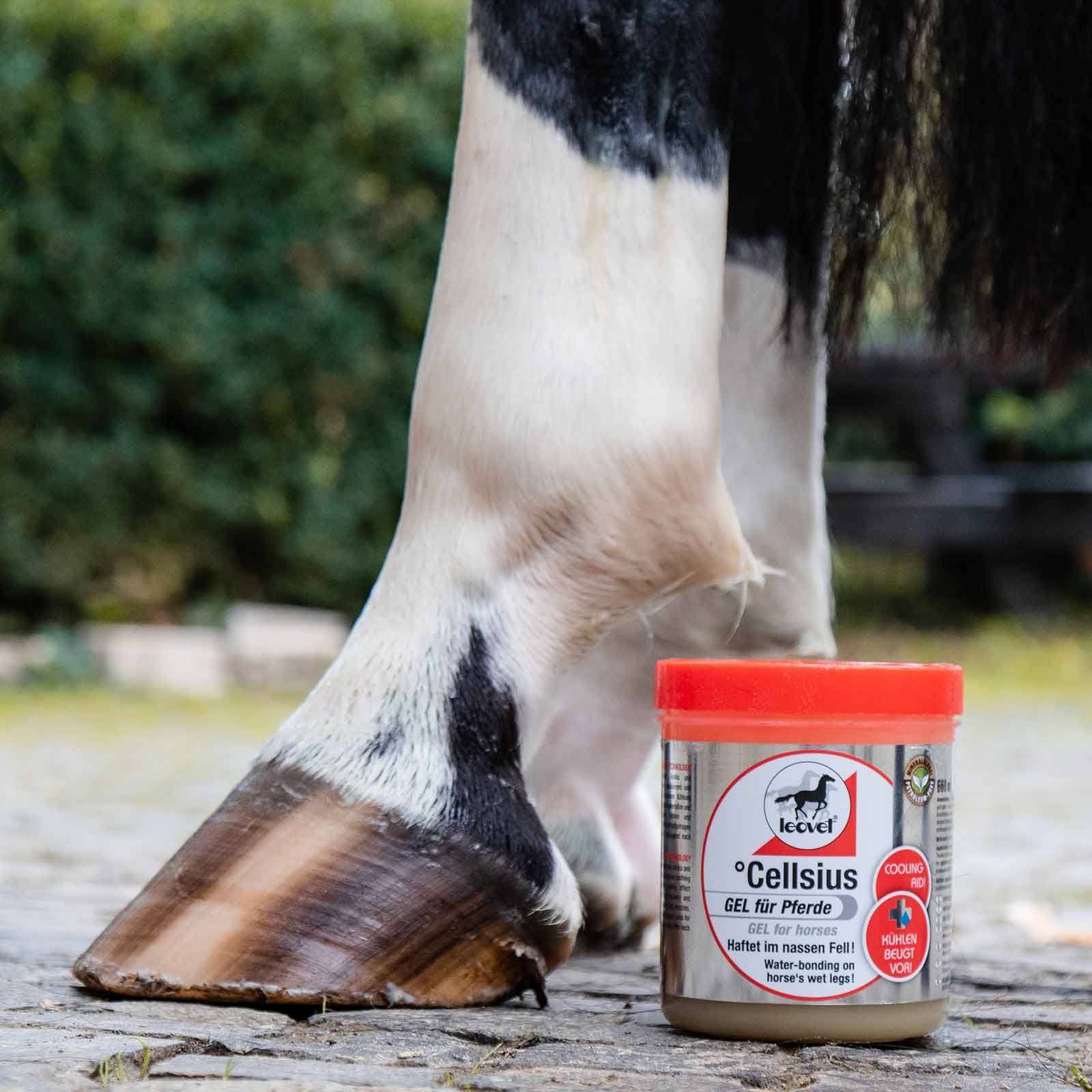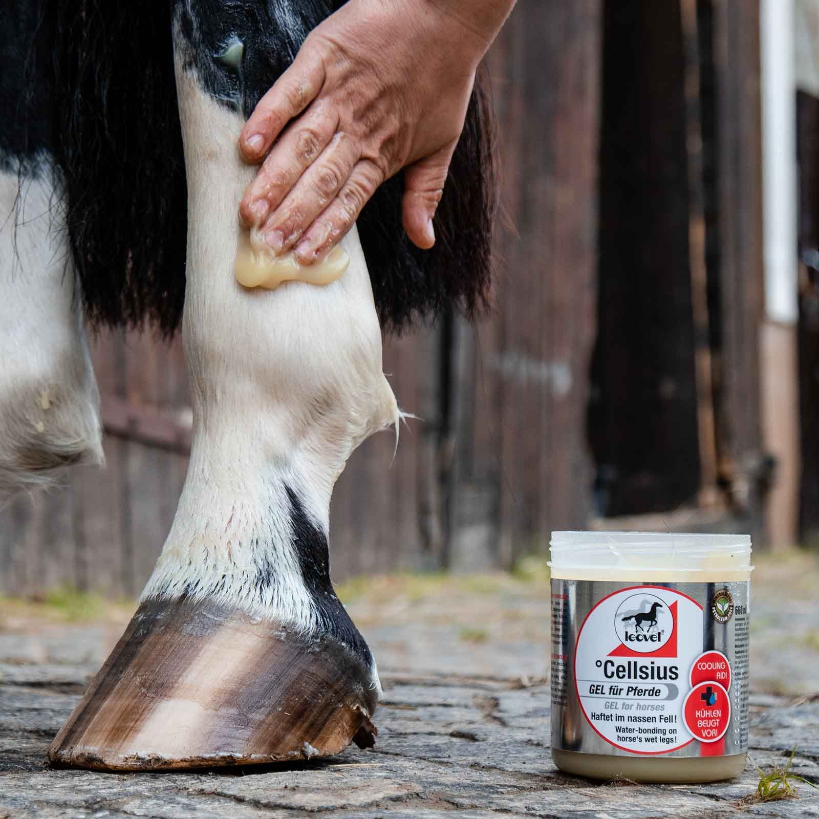 Das Leovet Cellsius Gel speichert die Kühlung die durch kurzes Abspritzen der Pferdebeine mit Wasser erreicht wurde. Das Pferde Kühlgel kann direkt nach dem Abspritzen auf das nasse Pferdebein aufgetragen werden und haftet ähnlich wie eine Kühlmanschette. Die starke langanhaltende Kühlung fördert aktiv die schnelle Regeneration und belebt beanspruchte Bänder, Sehnen und Muskeln. Die natürlichen Inhaltsstoffe Hamamelis, Weihrauchextrakt, Arnika und Rosmarin wirken adstringierend, vitalisierend und wohltuend.