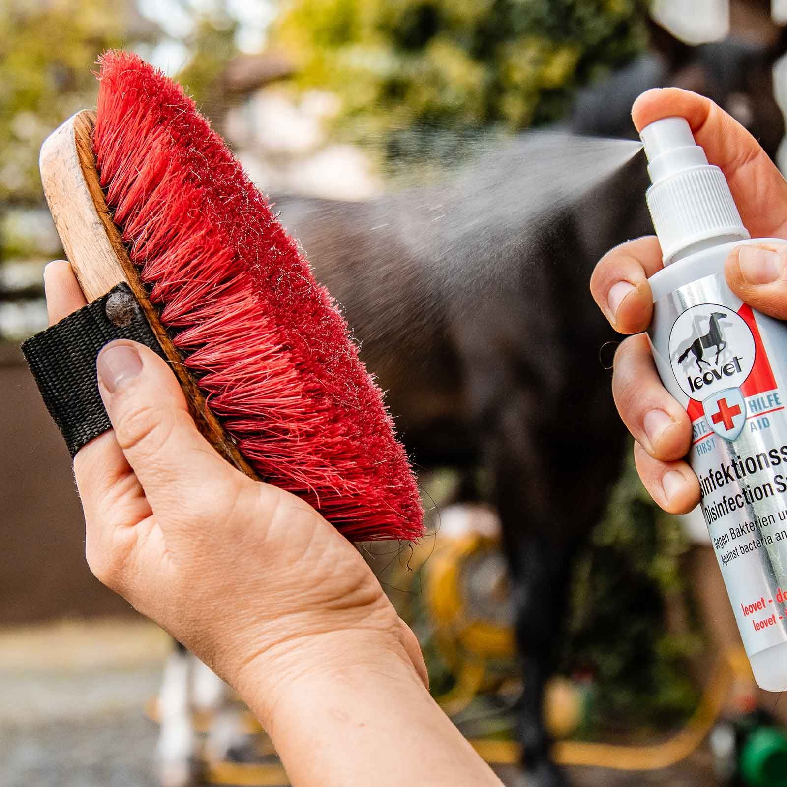 Ein unverzichtbares Produkt in jeder Stallapotheke ist ein Desinfektionsmittel zur Erstversorgung von Wunden. Der Leovet Erste Hilfe Desinfektionsspray tötet krankmachende Mikroorganismen, die Pferd und Reiter infizieren können ab. Das Pferde Desinfektionsmittel ist zum Auftragen auf Wunden geeignet. Es ist farblos, desinfiziert lückenlos und wirkt in kurzer Zeit intensiv. Auch im Stall ist der Desinfektionsspray unentbehrlich um Oberflächen zu desinfizieren.