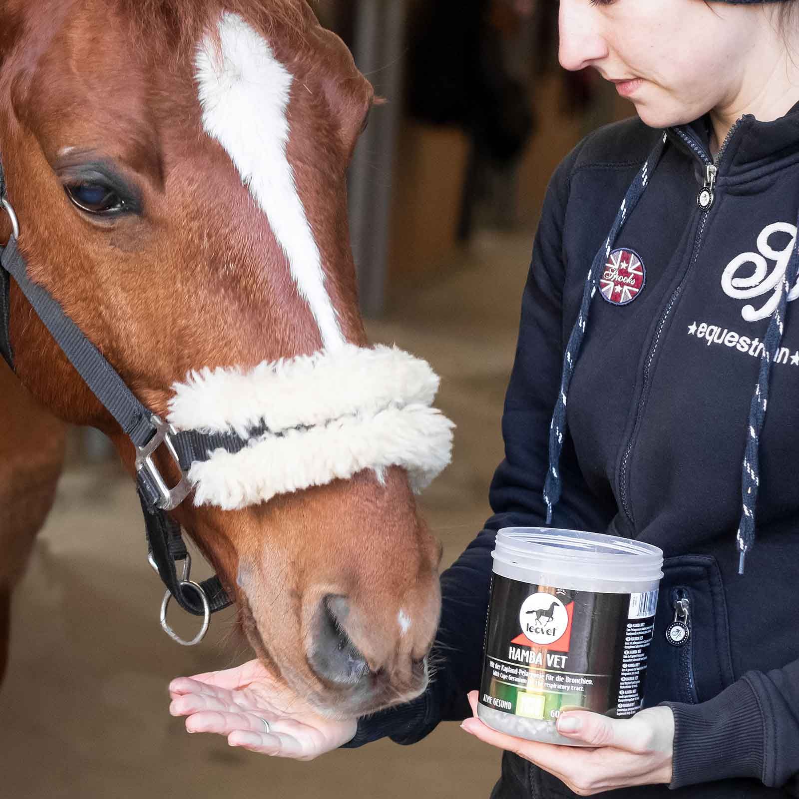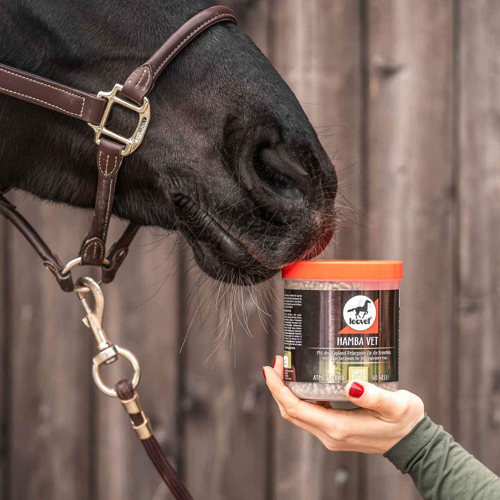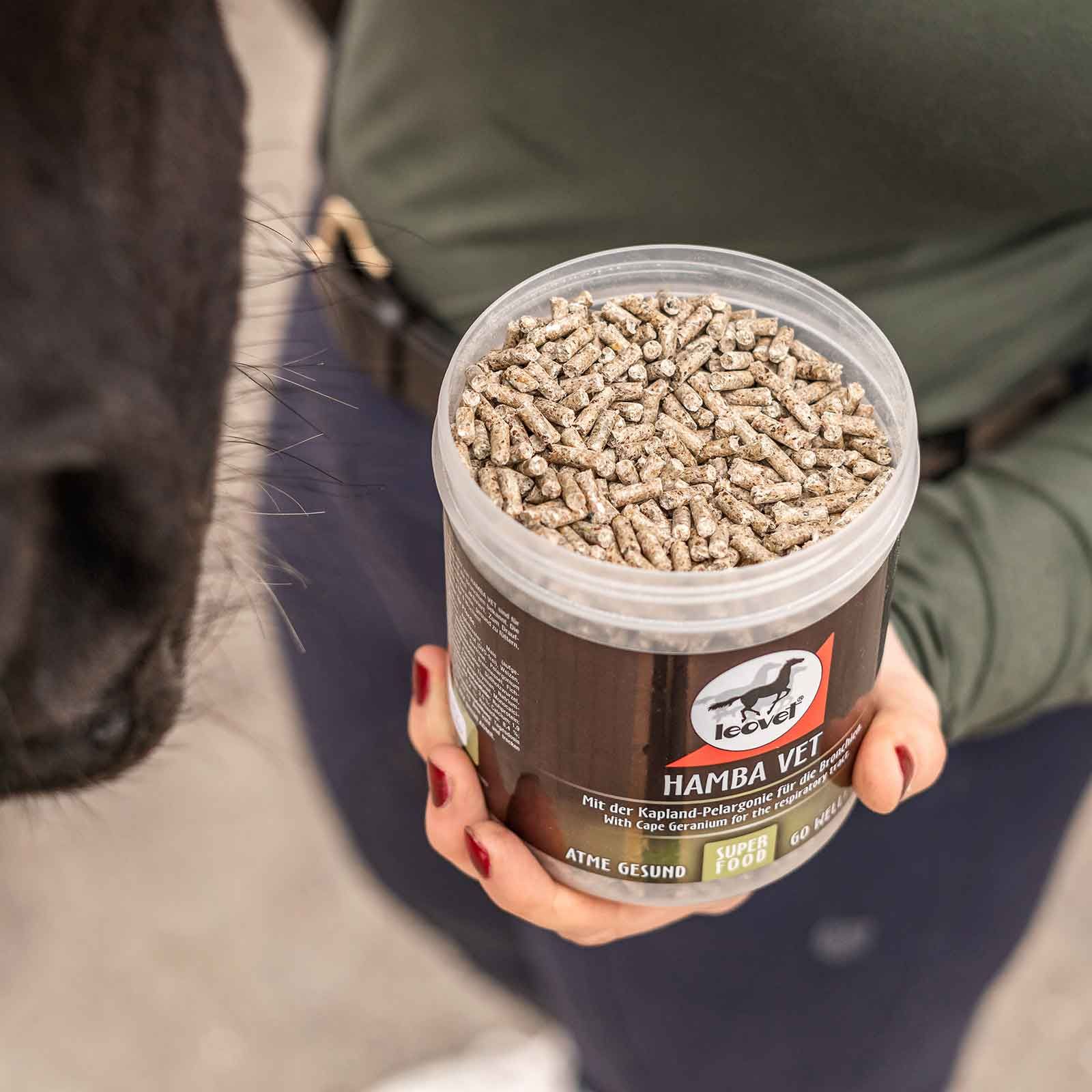Das Leovet Hamba-Vet ist durch viele natürliche Inhaltsstoffe effektiv wirksam. Das Ergänzungsfuttermittel in Pelletform enthält die Kapland-Pelargonie, eine Geranienart, aus der bekannte Heilmittel gegen Infektionen der Atemwege hergestellt werden. Zusätzlich ist das Hamba-Vet mit Kräutern wie Zinnkraut, Brennnessel, Huflattich und Süßholz angereichert, diese steigern das Immunsystem. Dadurch werden Abwehrkräfte aktiviert und vorbeugend vor Husten geschützt. Die enthaltene Eibischwurzel bildet eine Schutzschicht über der Schleimhaut der Atemwege und beruhigt. Fenchel hat einen wohltuenden Effekt auf die Bronchien und unterstützt gesunde Atemwege.