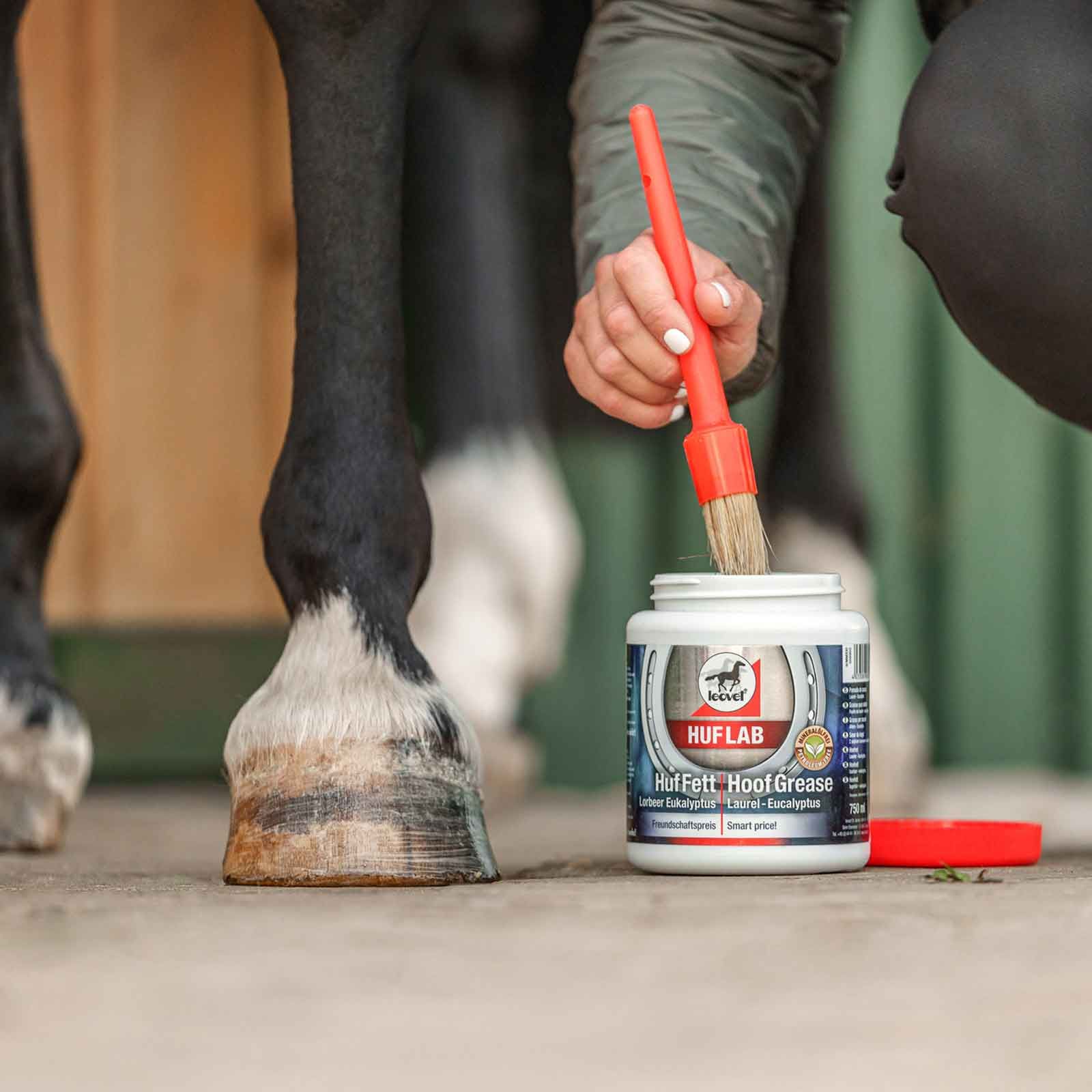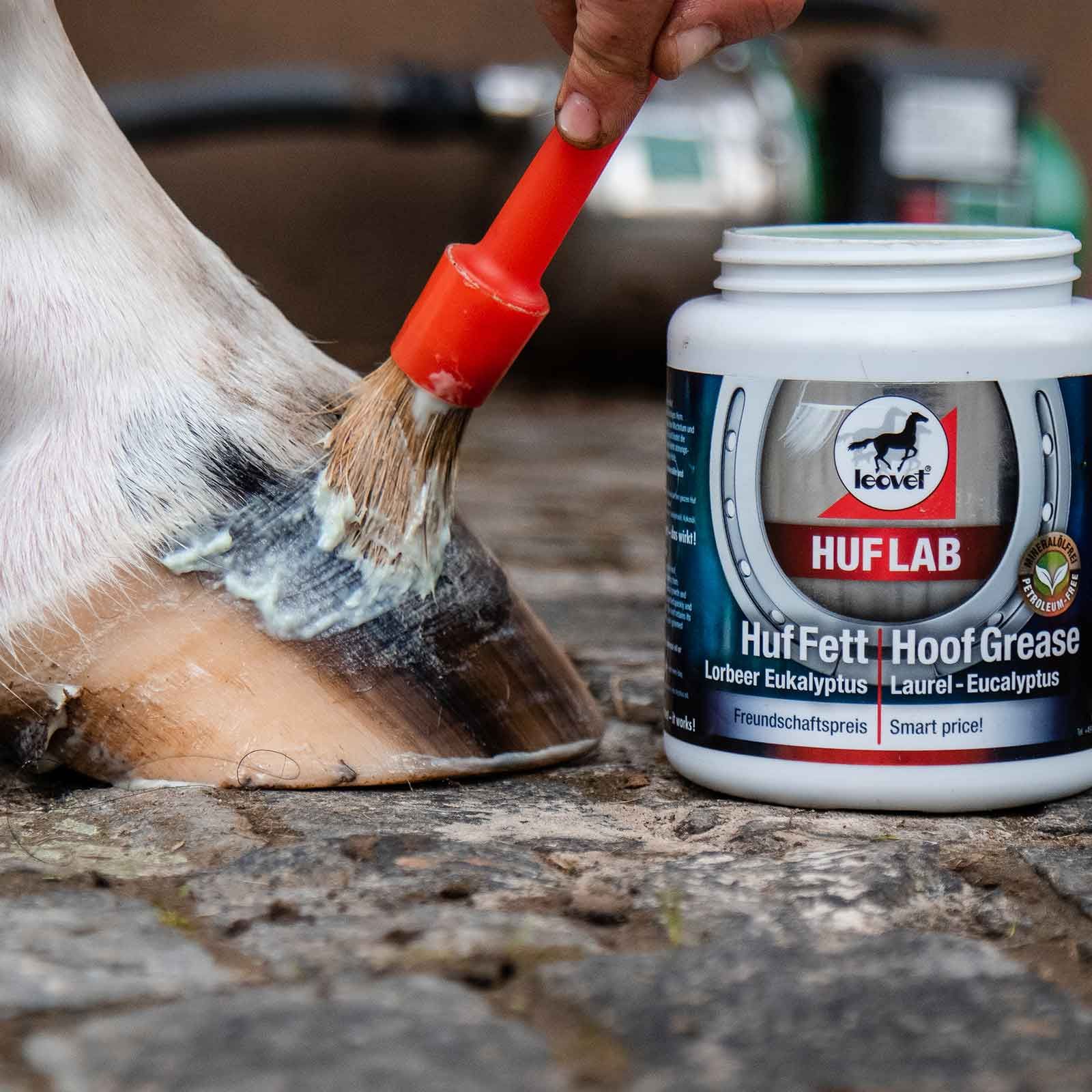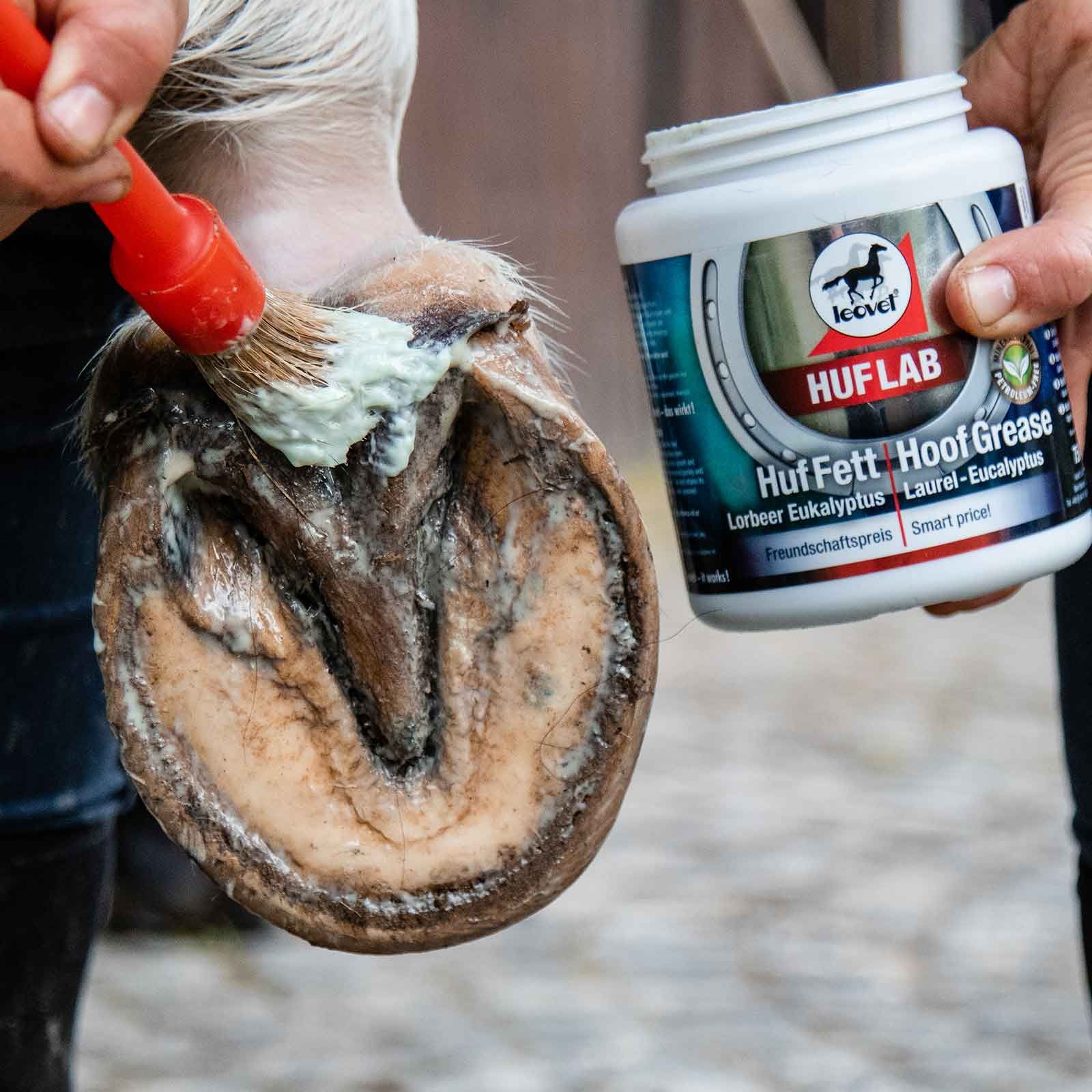 Das Huffett von Leovet regeneriert sprödes und brüchiges Horn. Das enthaltene Eukalyptusöl fördert natürliches Wachstum und Elastizität. Es zieht nach dem Auftragen schnell ein und bindet die Feuchtigkeit im Huf. Lorbeer vitalisiert und fördert die Durchblutung, somit wird das Hufwachstum angeregt und der Huf bleibt atmungsaktiv. Das Nelkenöl im Huffett von Leovet wirkt vorbeugend gegen Strahlfäule. Insgesamt macht es gesunde und optisch schöne, gepflegte Hufe.